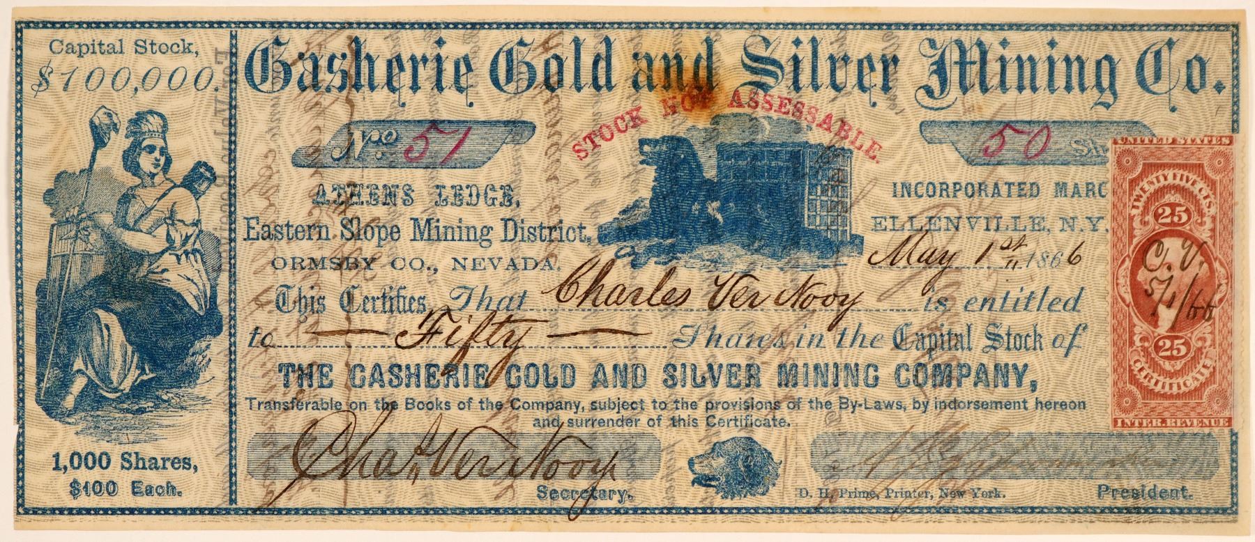 Extremely rare. Possibly the only one known. Athens Ledge, Eastern Slope Mining District, Ormsby Co., Nevada (printed to the left of vignette). Inc. March 1st, 1866. No. 51, issued for 50 shares to company secretary Charles Ver Nooy on May 1st, 1866 in Ellenville, New York. Signed by Ver Nooy and the president (illegible). Not cancelled. Blue border and print, and three vignettes: dog next to safe (top center), dog's head (bottom center) and allegorical woman (left side). Printed by DH Prime, NY. 25 cent adhesive stamp attached on the right. 3.25 x 8" Folds, stain top center. This district is NOT listed by Tingley. We could find no information on this company on CDNC, newspapers.com, or Holabird indexes. In 2011, Holabird-Kagin Americana did sell an Athens Gold and Silver Mining Company Stock (1865) that was also from this district. City: Ormsby County, Eastern Slope Mining District State: Nevada Date: 1866