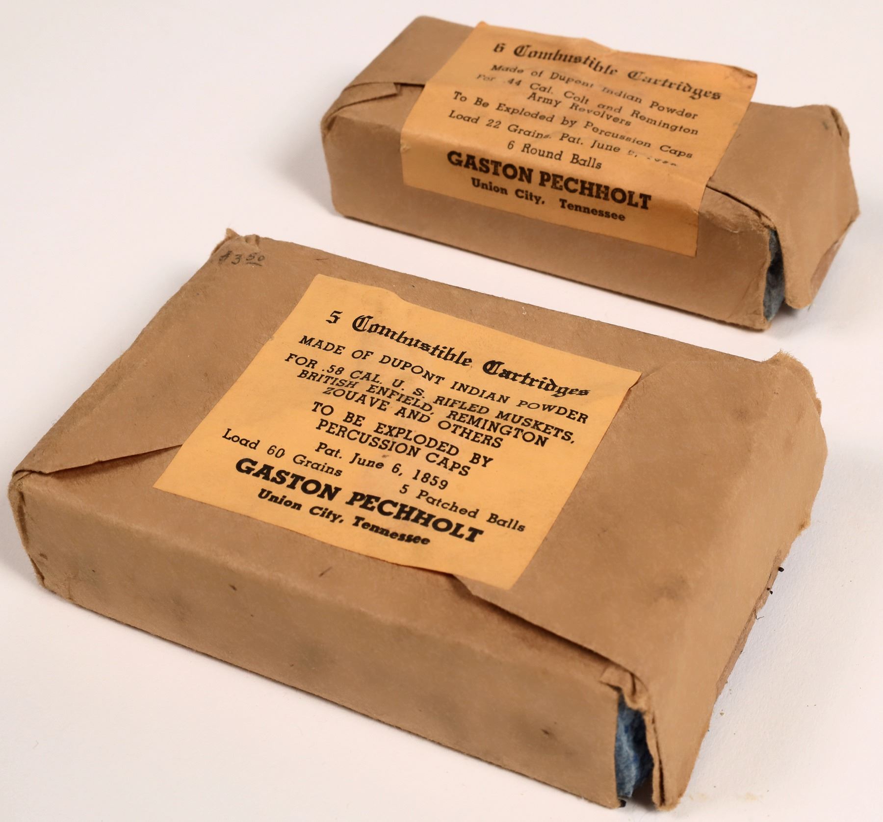 This lot has two boxes of Gaston Pechholt combustible cartridge packets dated 1859. One is marked "6 combustible cartridges for .44 cal. Colt or Remington Army Revolvers. Load 22 grains Pt. June 5,1859 /6 round balls /Gaston Pechholt/ Union City, Tennessee". This box has been opened and assumed to be incomplete. Packed in a type of foam brick. The second box is also a "Gaston Pechholt/ Union City, Tennessee/ 5 Combustible Cartridges/ MADE OF DUPONT INDIAN POWDER/ FOR .58 CAL. U.S. RIFLED MUSKET, BRITISH ENFIELD, REMINGTON ZOUAVE AND OTHERS/ TO BE EXPLODED BY PERCUSSION CAPS/ PAT. June 6, 1859/ loaded 60 grains 5 patched balls ". This box has also been opened, with foam brick package. Loose powder is visible. No sales to New York, New Jersey, California, Hawaii, or Alaska. No international sales. Additional shipping fees apply. Please see photos for sale.