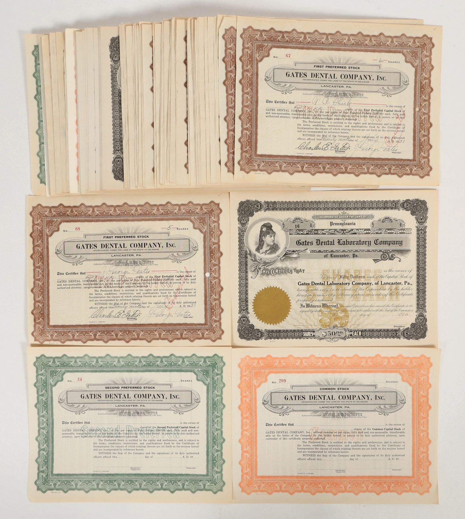 There are approximately 150 stocks for the Gates Dental Company. Several are issues to George Gates, others are unissued. 1920-1931.