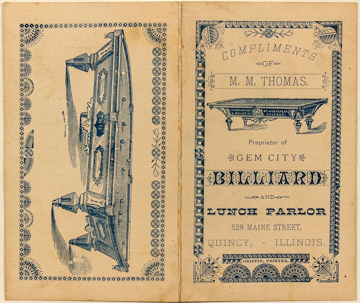 A choice two-sided business card: Compliments of M. M. Thomas, Proprietor of Gem City Billiard and Lunch Parlor. The other side has an illustration of a billiard table.