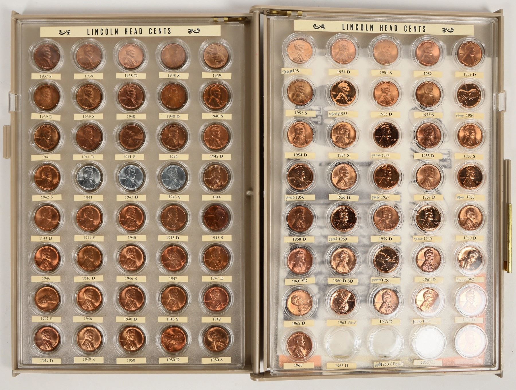 Interesting hard plastic "TT" coin case with 77 gem Lincoln cents from 1937-1965. Most uncirculated, many proof coins. Included is advertising for the "TT" brand of coins cases.