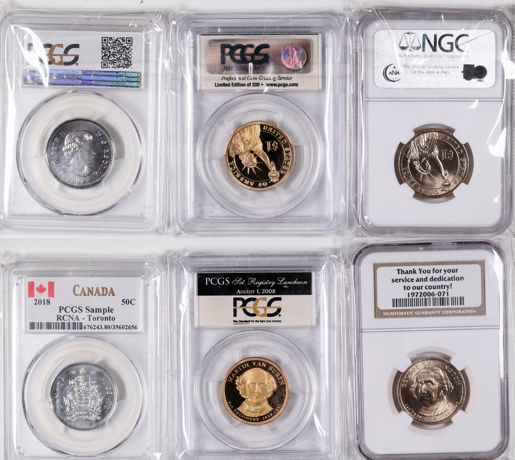 Lot of three: 1) PCGS sample 2018 Canada 50c, RCNA show in Toronto; 2) 2008 PCGS Set Registry Luncheon souvenir Martin Van Buren presidential dollar; 3) ANA Veterans Thank You Dollar: George Washington presidential dollar in NGC holder: Thank You for your service and dedication to our country!.