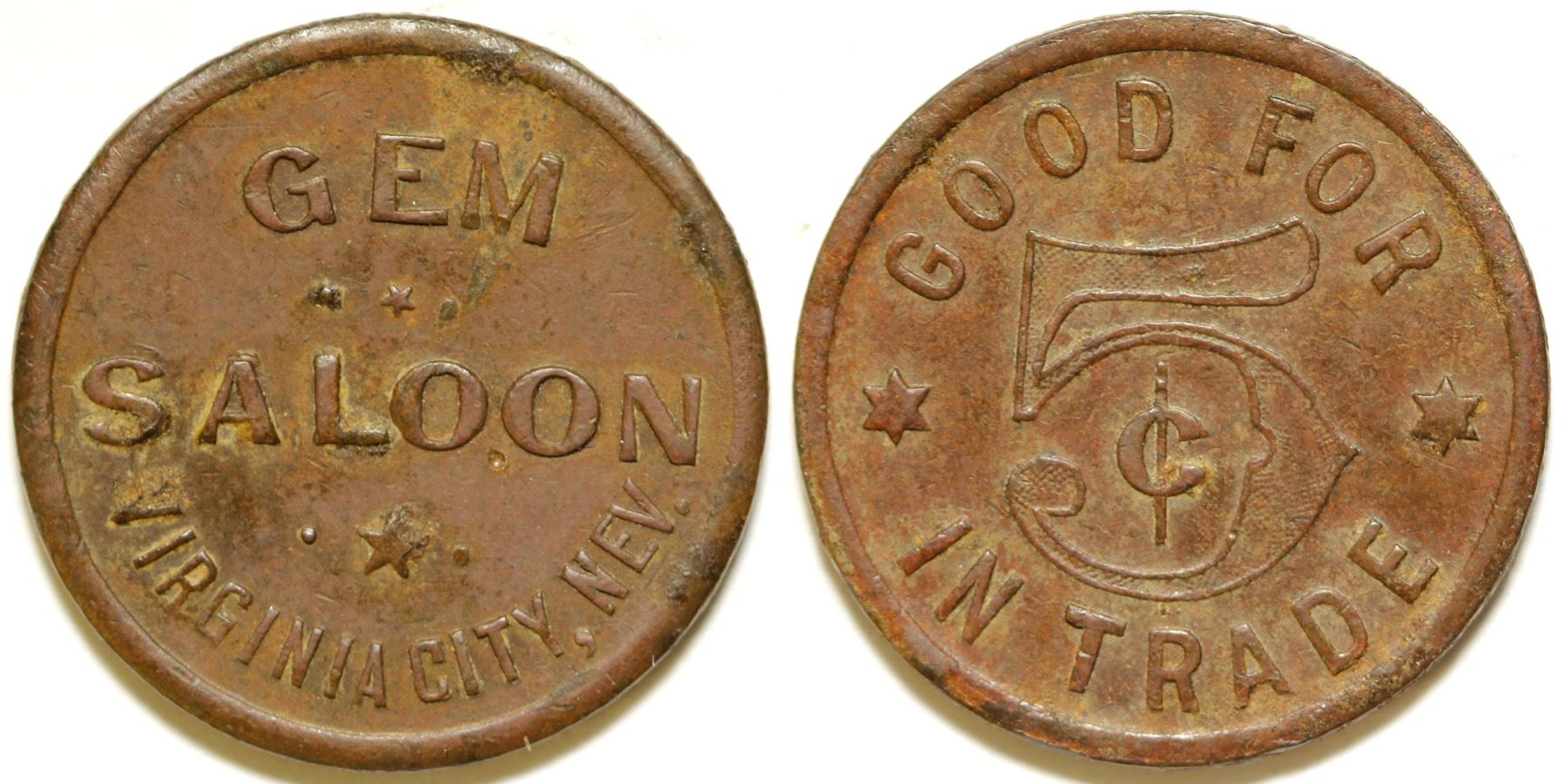 Obv.: Gem / Saloon / Virginia City, Nev.; Rev.: Good For / 5c / In Trade. Br., rd., 21 mm. Daniel Manassillian Collection. State: Nevada City: Virginia City Date: HWAC# 84378