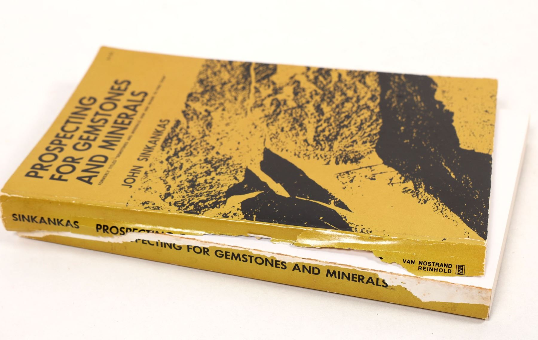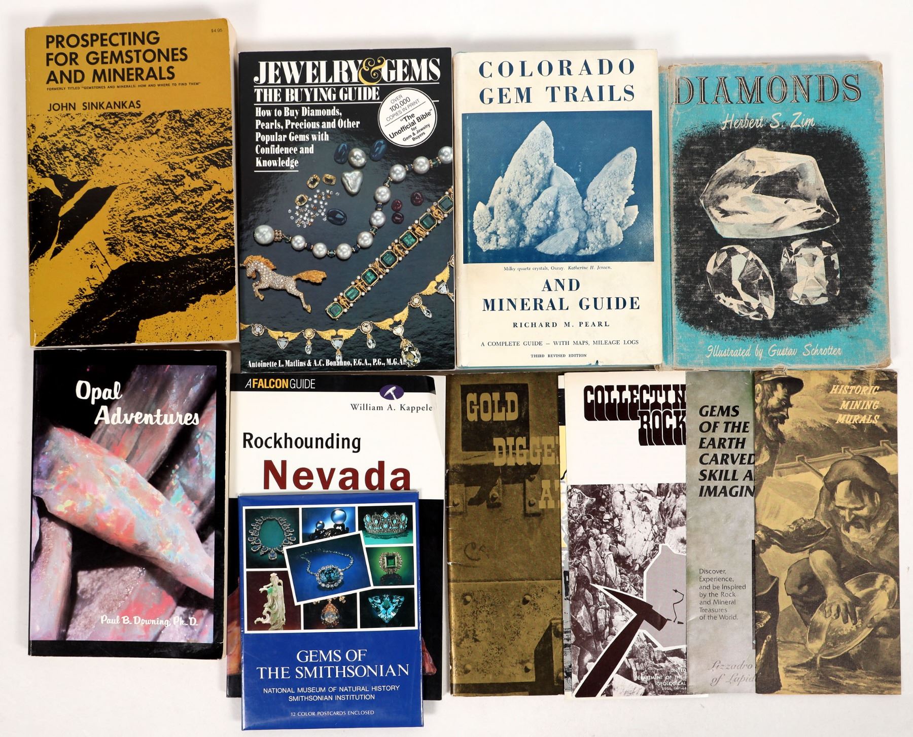 A collection of 7 books and 5 brochures on gems and minerals, published 1959-1998. The lot covers topics such as rockhounding and prospecting, buying and selling minerals, and informational/historical material about minerals. The books are generally in good condition, though one older book has heavy wear along the spine/edges of cover. See photos for all titles.