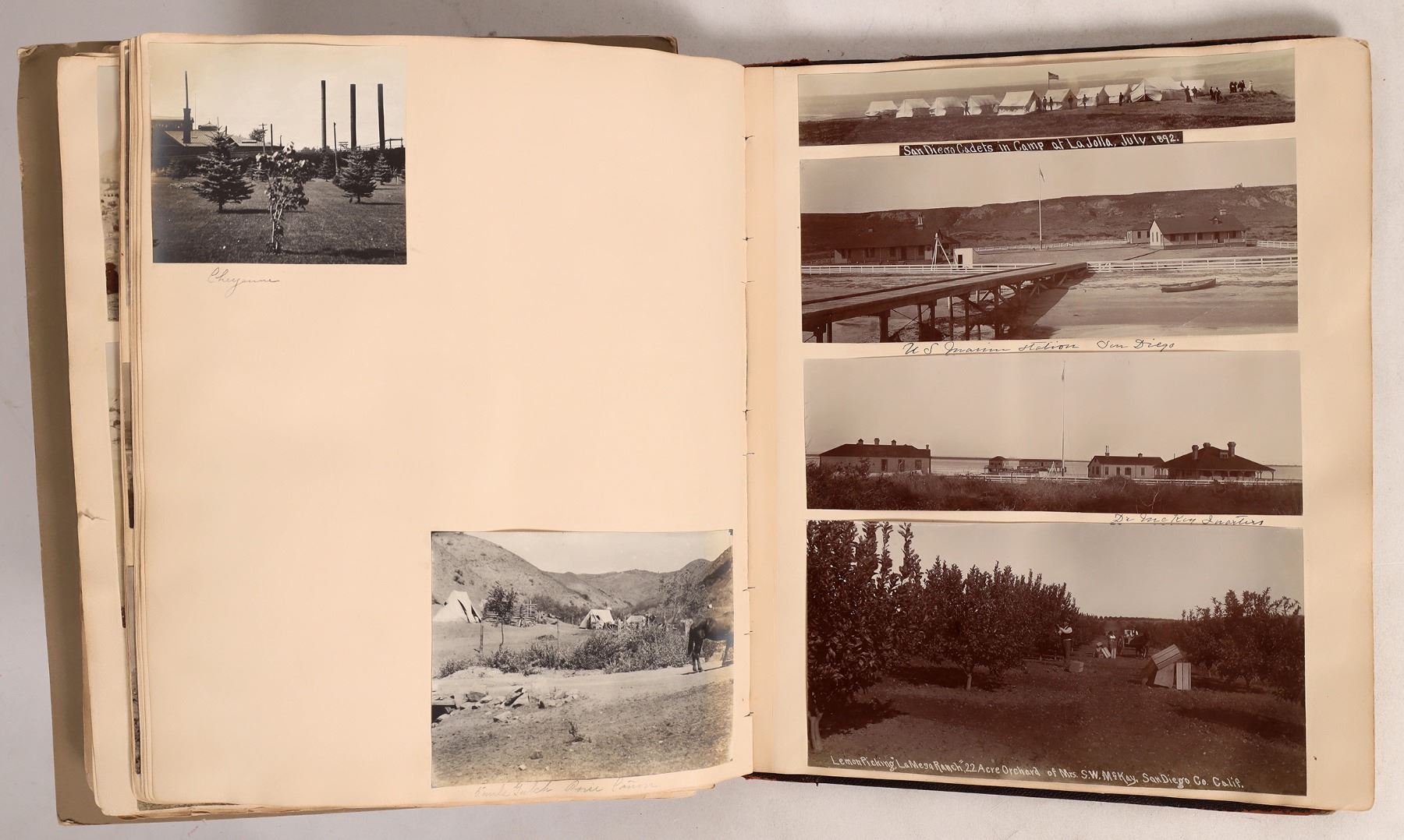 The album consists of 355 original photographs mostly albumen prints along with a few blue sepia tones. Wilcox himself appears to have been the photographer, as he is absent from all of the group shots. At least half are 5 x 7”. The inventory does not count printed photos from outside sources, such as magazines. It does count the occasional original photographs that may have been taken by others. A few are board mounted, but not noted below. Two mounted photo portraits of Wilcox accompany the collection.