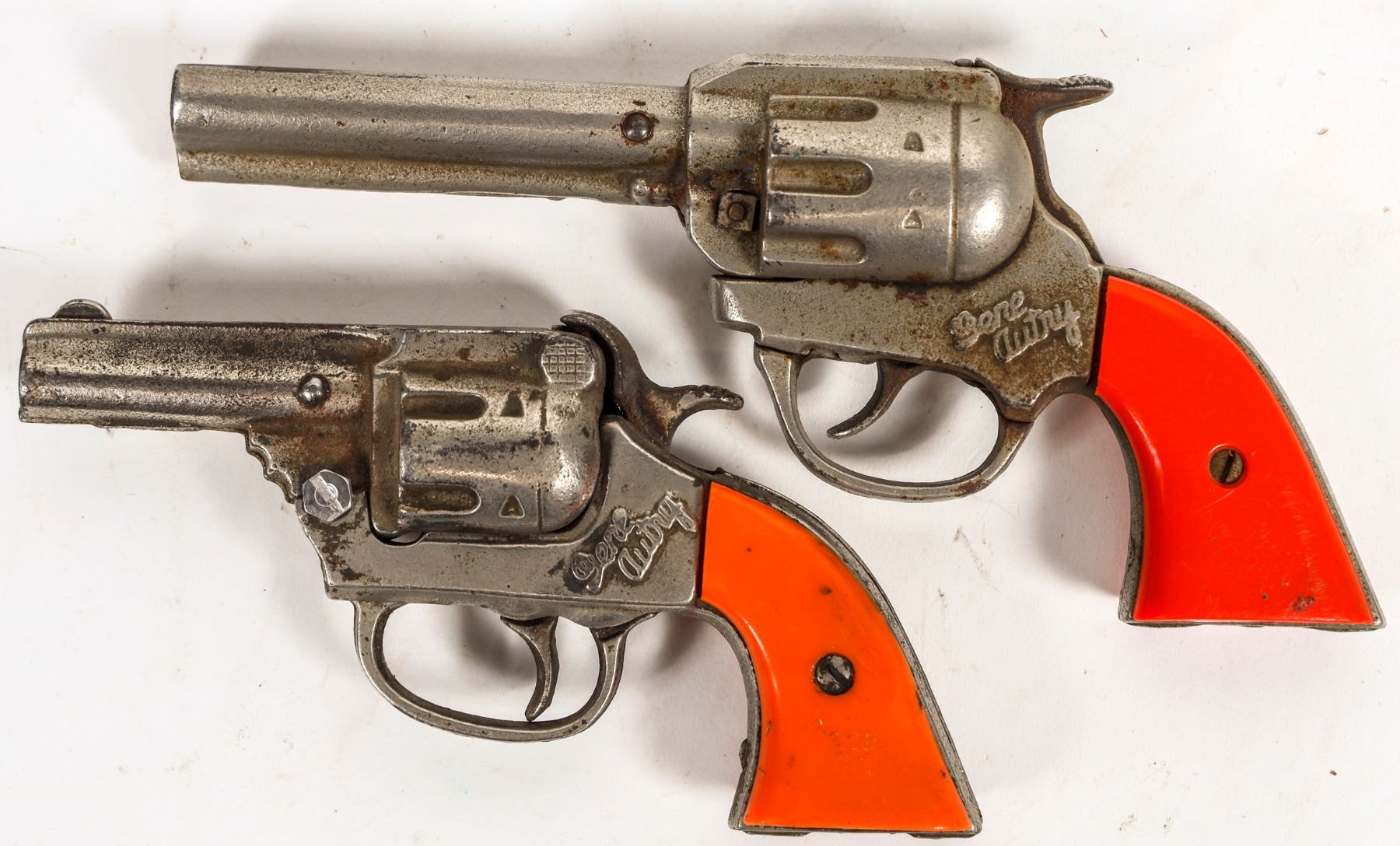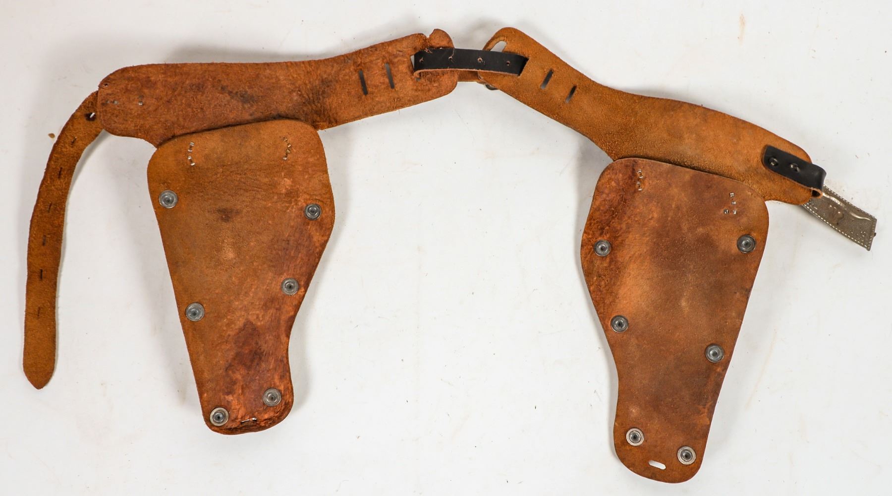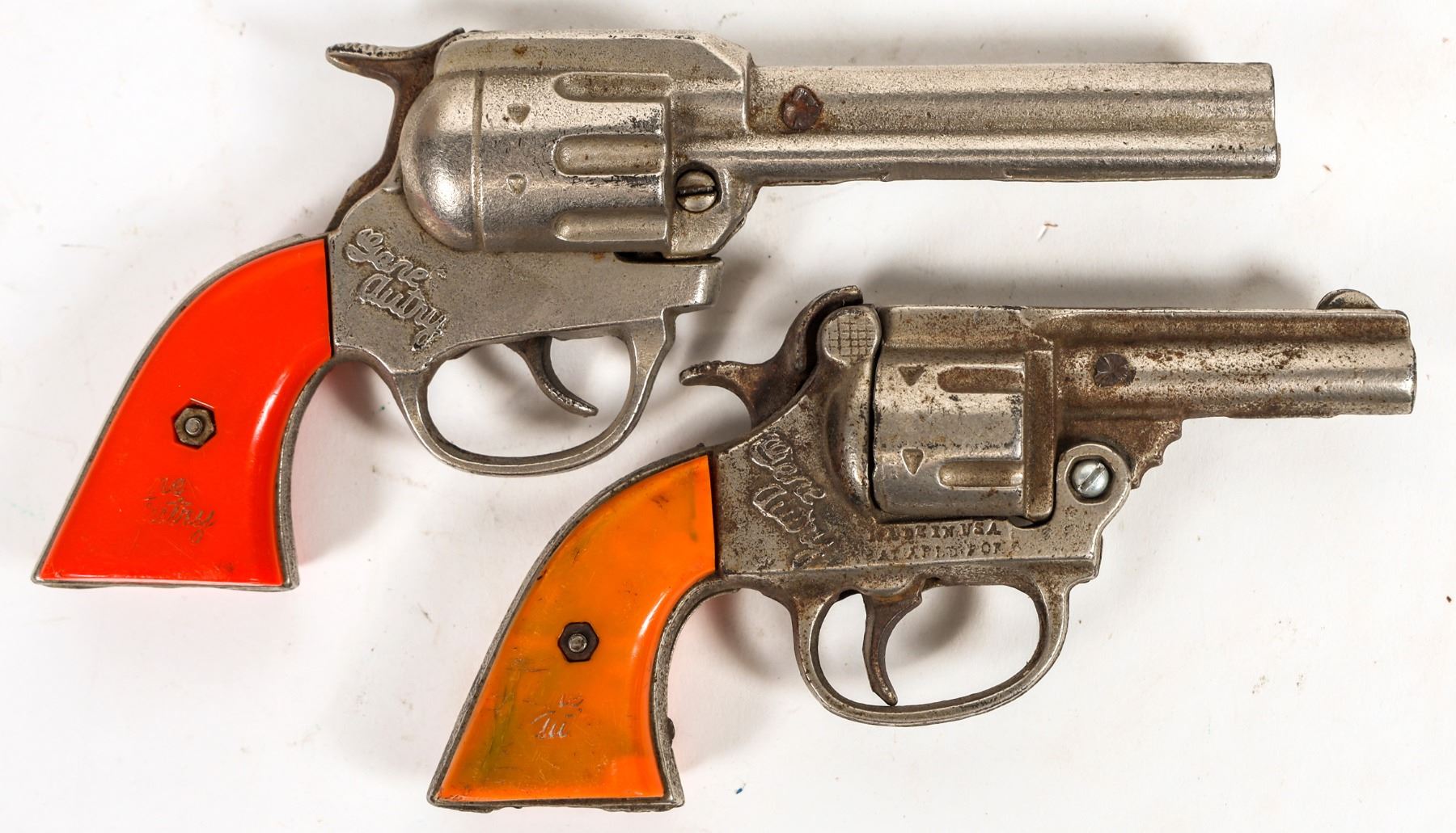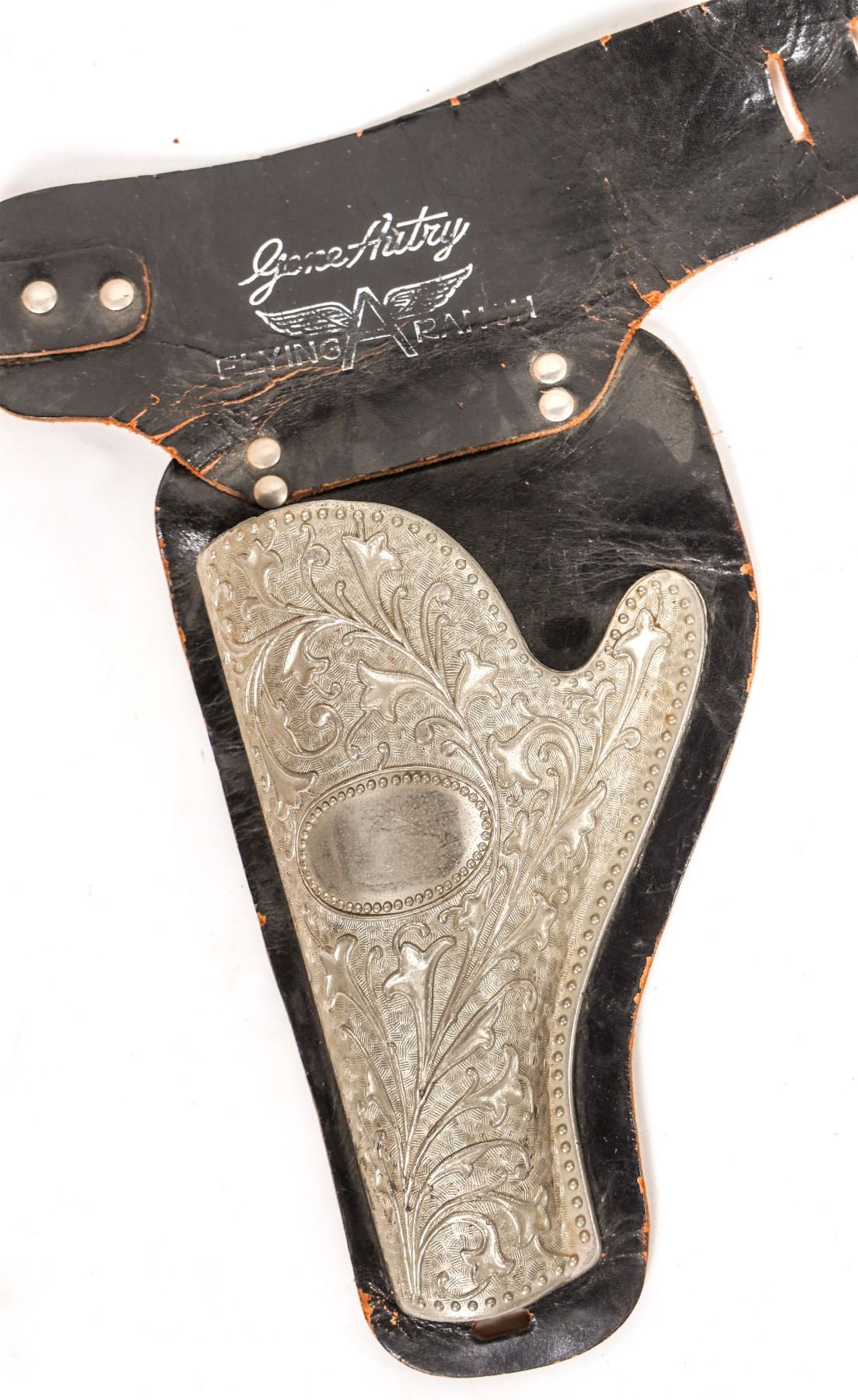 There are two cap pistols marked for Gene Autry on the grips and frame. The holster is silver mounted leather. The belt is marked for "Gene Autry /Frying A Ranch". Condition is good.