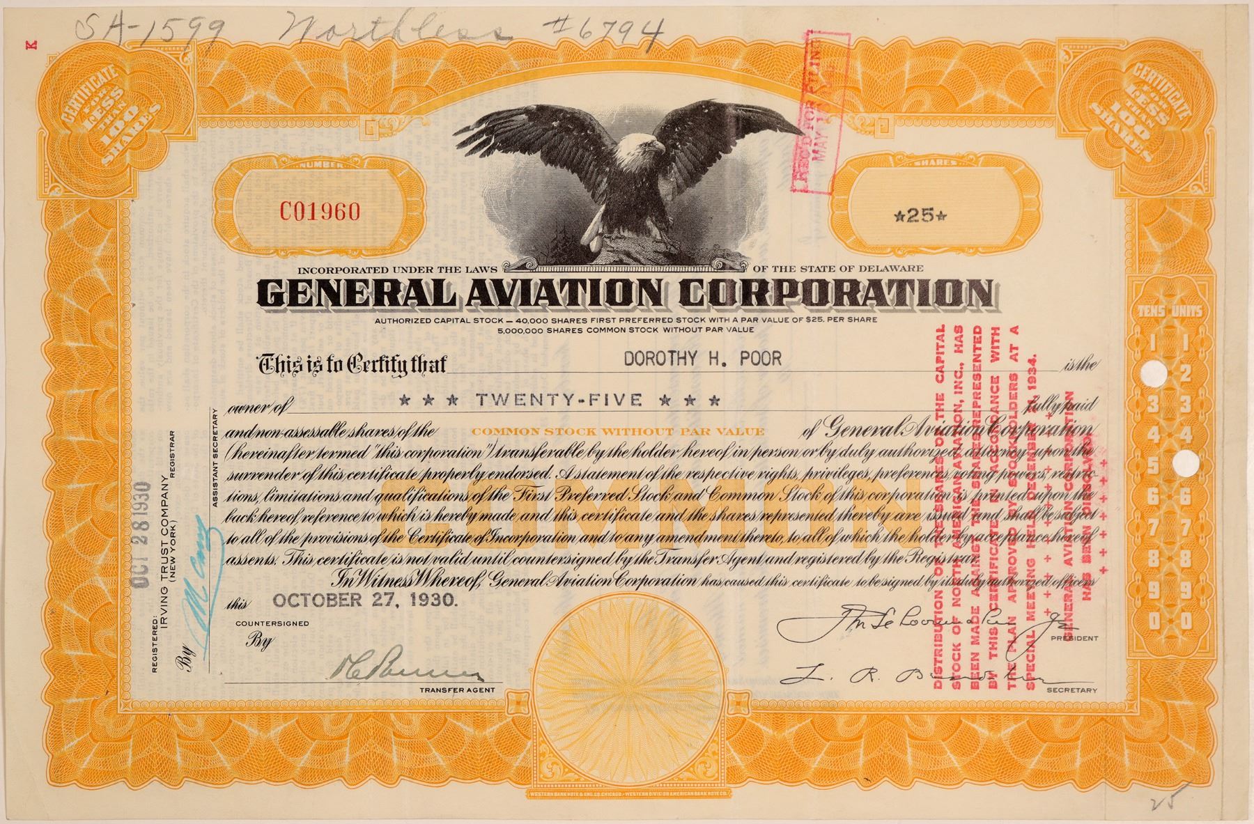 # C1960 for 25 shares to Dorothy H Poor. Bright yellow. Dateline October 27, 1930. Not cancelled. Wrinkles, dog ears, pencil notes. Its claim to fame was when it absorbed the Fokker-America a subsidiary of General Motors. The Fokkers turned out to be inferior to the new Douglas fighters. So they were purchased and equipped five squadrons were ultimately equipped with these planes, two observation, two bombardment, and one pursuit squadron. These planes were operated primarily for radio practice flights, night navigation training, and long-distance cross-country practice flights. Ken Prag Collection