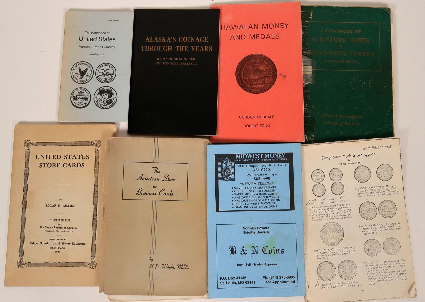 Lot of 7. These are general books on tokens, early references. 1) Hawaiian Money And Medals. Gordon Medcalf. 2) Alaska's Coinage Through the Years by Maurice M. Gould and Kenneth Bressett. 3) Missouri Journal of Numismatics Volume 19, July 1994. 4) The Handbook of United States Municipal Trade Currency, Jean-Guy Cote. 5) United States Store Cards by Edgar H. Adams. 1962. 6) A Catalogue of U.S. Store Cards or Merchants Tokens By Donald M. Miller. A Part of the Unoffical Coinage of the U.S. 7) The American Store or Business Cards by B. P. Wright, M.D.
