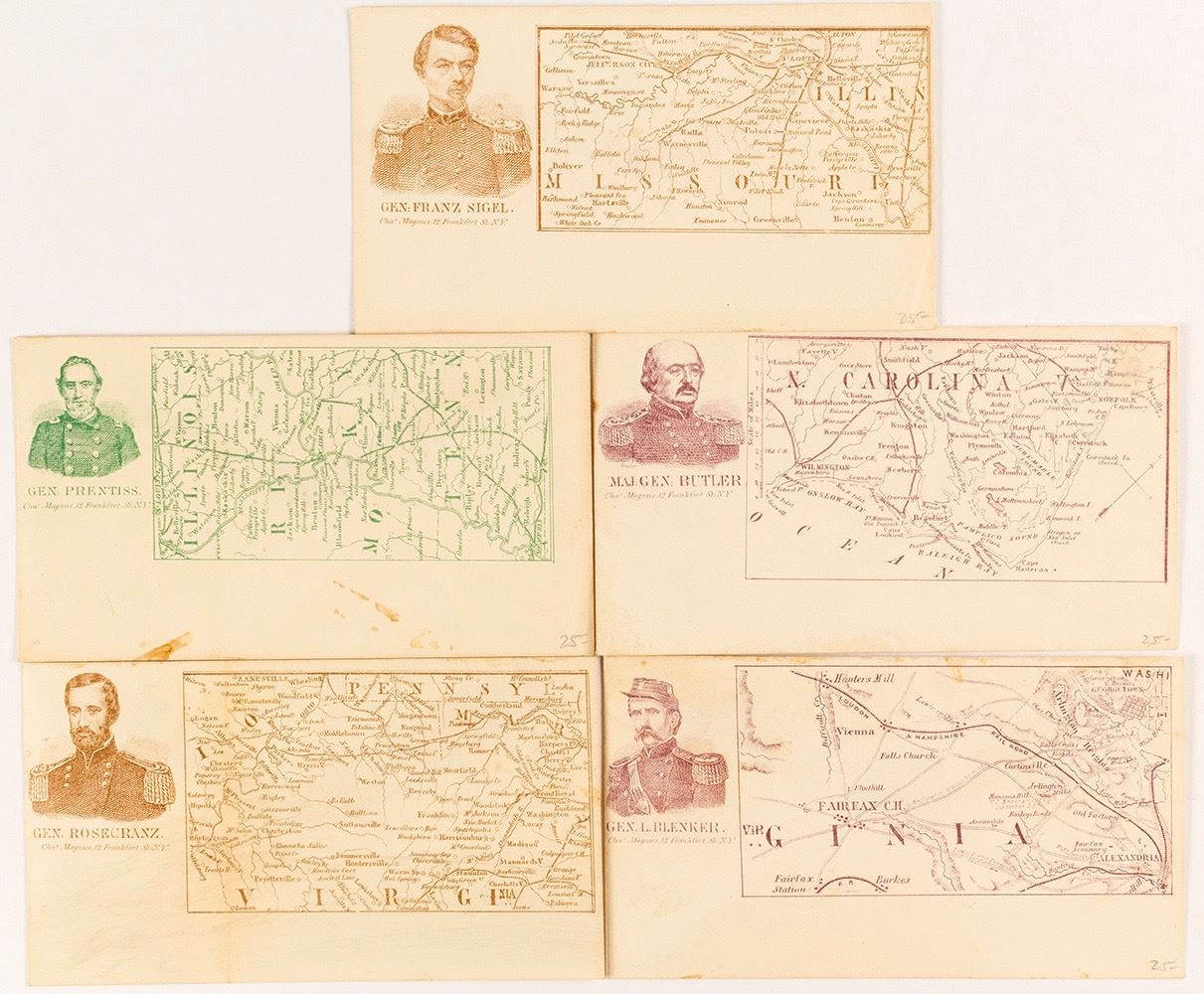 Lot of 5. 1) Gen. Prentiss full face Civil War patriotic cover with map of Illinois, Kentucky, and Tennessee. Green. 2) Gen. Rosencranz full face Civil War patriotic cover with map of Virginia. Brown. 3) Gen. Franz Sigel full face Civil War patriotic cover with map of Missouri. Brown. 4) Maj. Gen. Butler full face Civil War patriotic cover with map of North Carolina. Purple. 5) Gen. L. Blenker full face Civil War patriotic cover with map of Virginia. Purple. All by Magnus. Date: Location: New York, New York HWAC # 54577