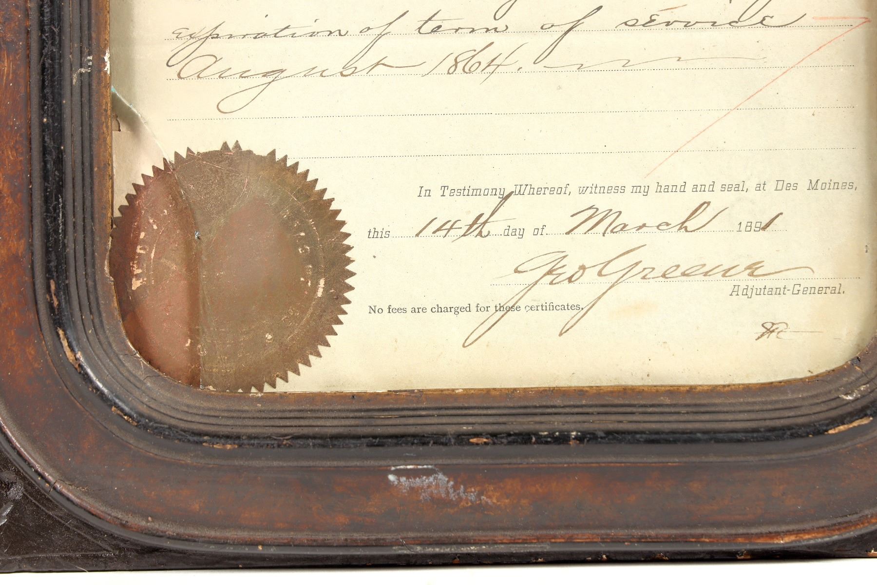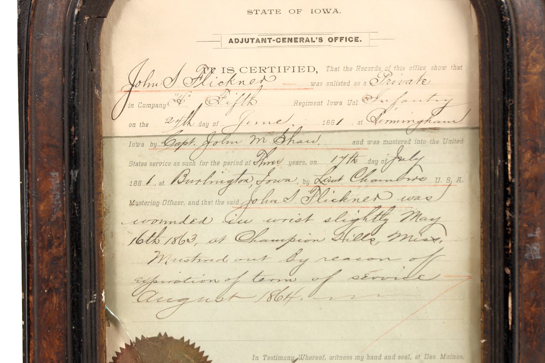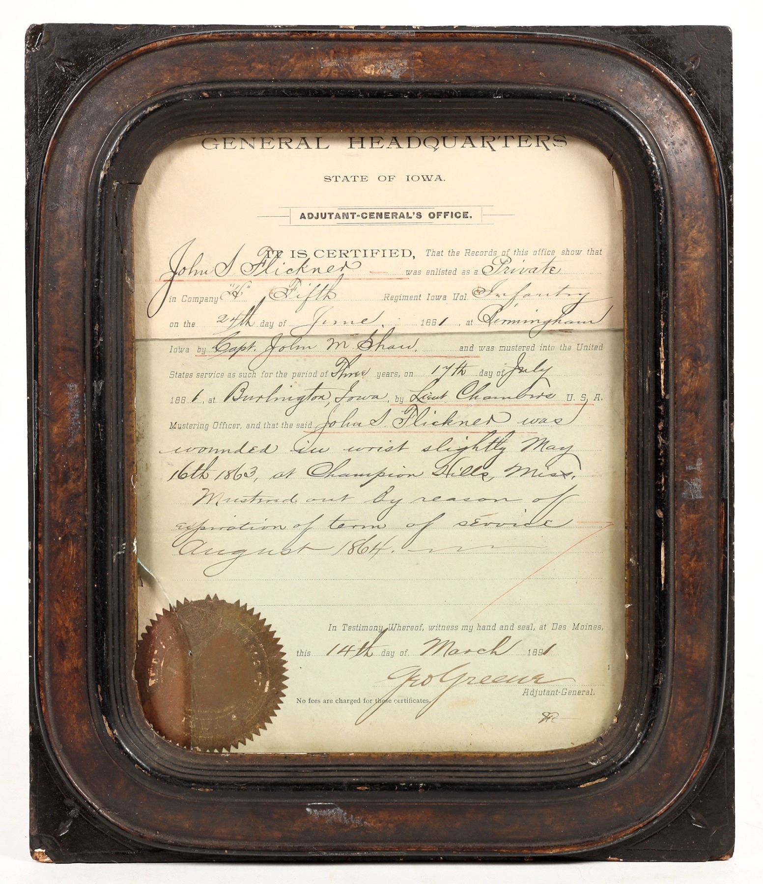 13 x 11" framed, no glass. Document stating John S Flickner was wounded in the wrist on May 16 1863 at champion hills Mississippi. General George Greene was a civil engineer during the American Civil War.
