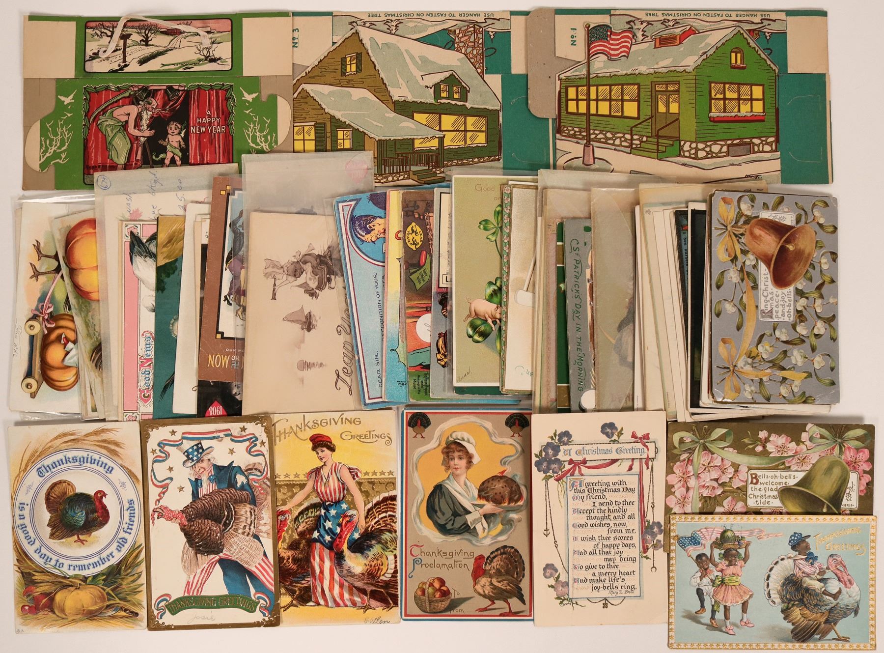 Lot of 70 holiday and special occasion postcards. Includes Christmas, Thanksgiving, Leap Year, Valentine's Day, St. Patrick's Day, April Fools, New Baby, etc. No Halloween. Colorful and pictorial. Mailed pieces date 1907-1921.