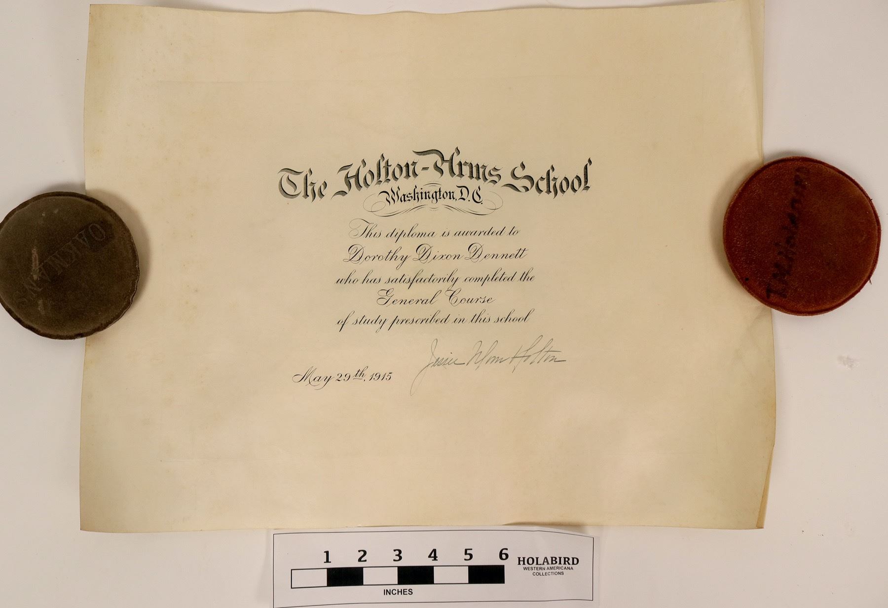 1) Holton-Arms School Washington, D.C. diploma, signed by Jessie Moon Holton, dated May 29th, 1915, awarded to Dorothy Dixon Dennett, "who has satisfactorily completed the General Course of study proscribed by this school." 14 3/4 x 19 5/8" Diploma with toning, particularly to lower third; minor edge wear. Minute foxing spots, scattered on surface of diploma. 2) United States General Land Office 1912 cast bronze medal, depicting an eagle, obverse, with "CENTENNIAL OF THE ORGANIZATION OF THE GENERAL LAND OFFICE 1812-1912", reverse. Housed in a black leather case with purple satin and velvet interior lining. Stamped "Jos. K. Davidson's Sons, Philadelphia" in gilt lettering, inside of case, stamped "Hon. Fred Dennett" in gilt lettering, lid of case. Medal – 2" dia. Case – 7/8" H x 3" W x 3" D.