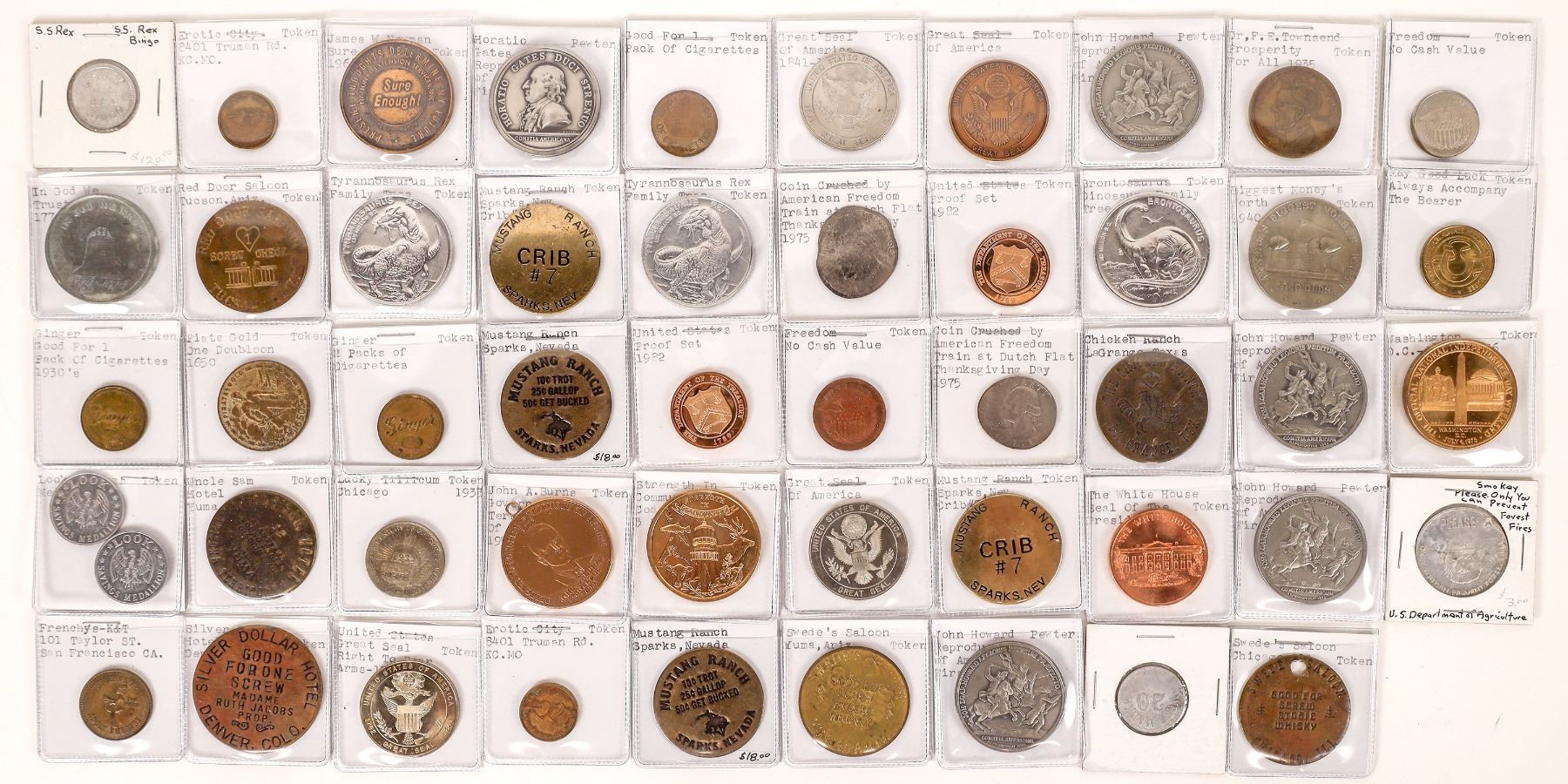 Miscellaneous lot of over 40 tokens and medals. S.S. Rex Bingo token; In God We Trust; Uncle Sam Hotel, Yuma; Erotic City, Kansas City; Silver Dollar Hotel, Denver; John Howard pewter reproductions of America's First Medals; Mustang Ranch; Chicken Ranch; dinosaur medals.