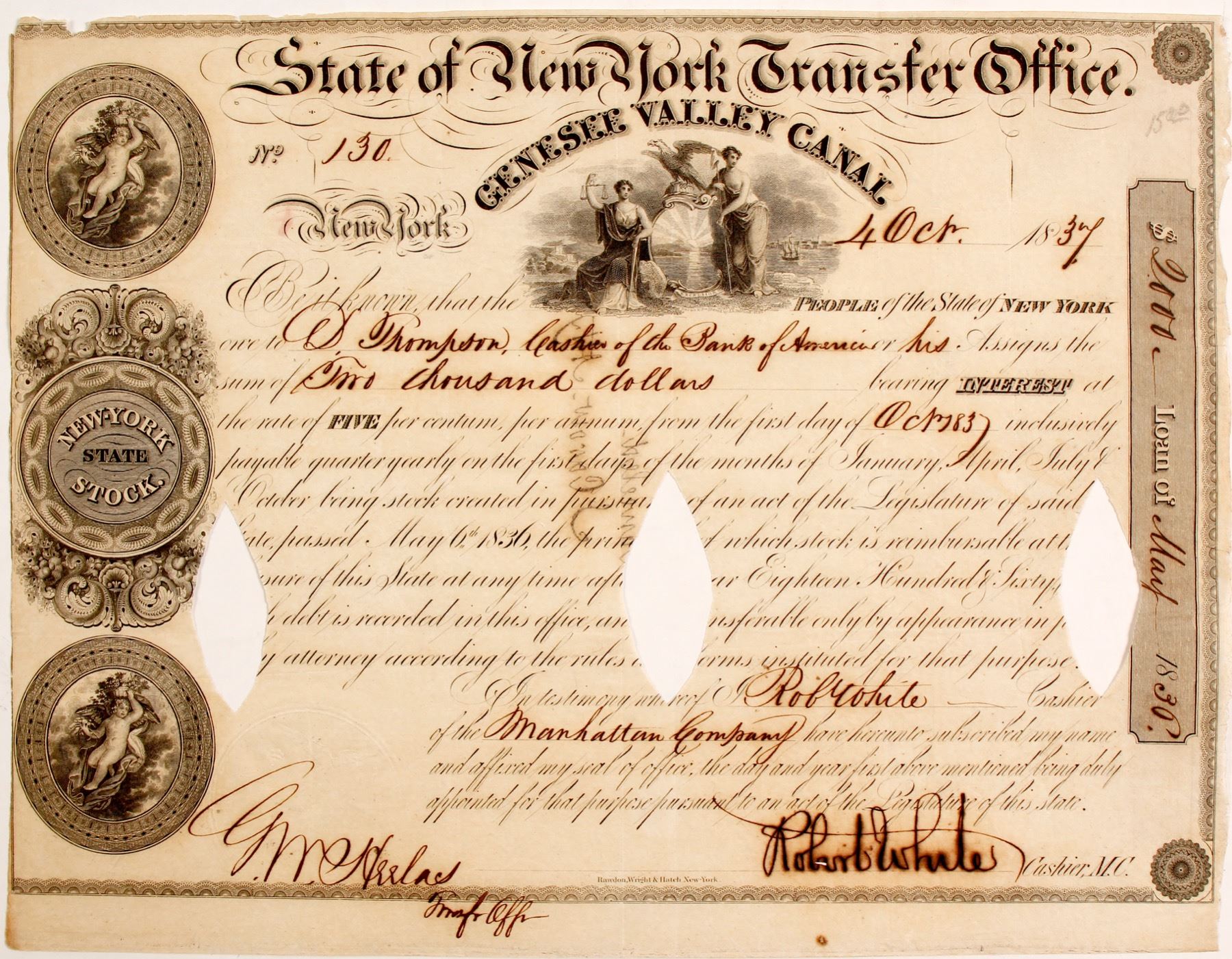 Issued punch cancelled. #130 D Thompson $2000 loan? at 5% 1837. Signed by Cashier Robert White. " The Genesee Valley Canal is a former canal that operated in central New York between 1840 and 1877. Its course was later used by the Genesee Valley Canal Railroad and today comprises portions of the Genesee Valley Greenway." from wikipedia. Prag Collection. State: New York City: Date: 1837 HWAC# 83442