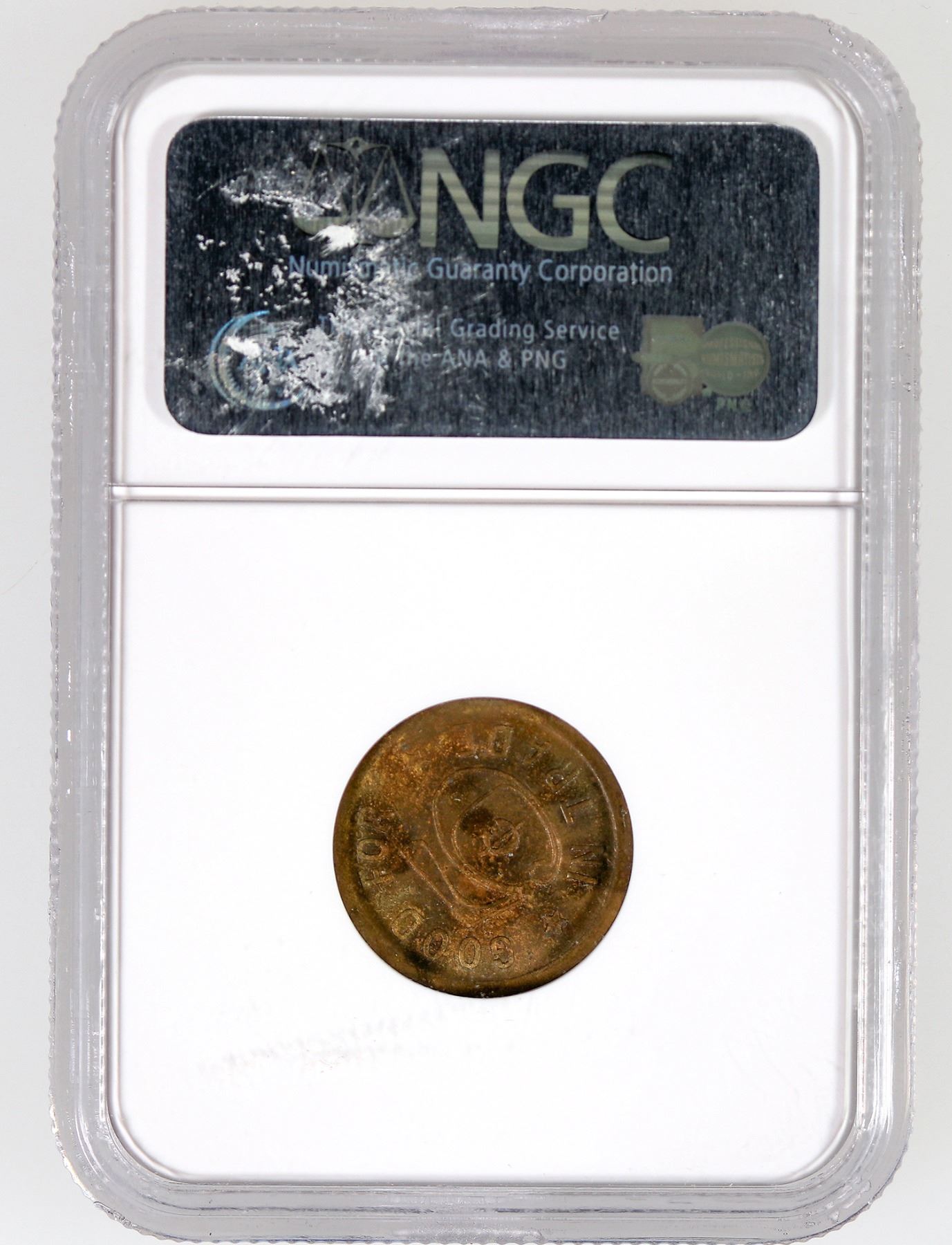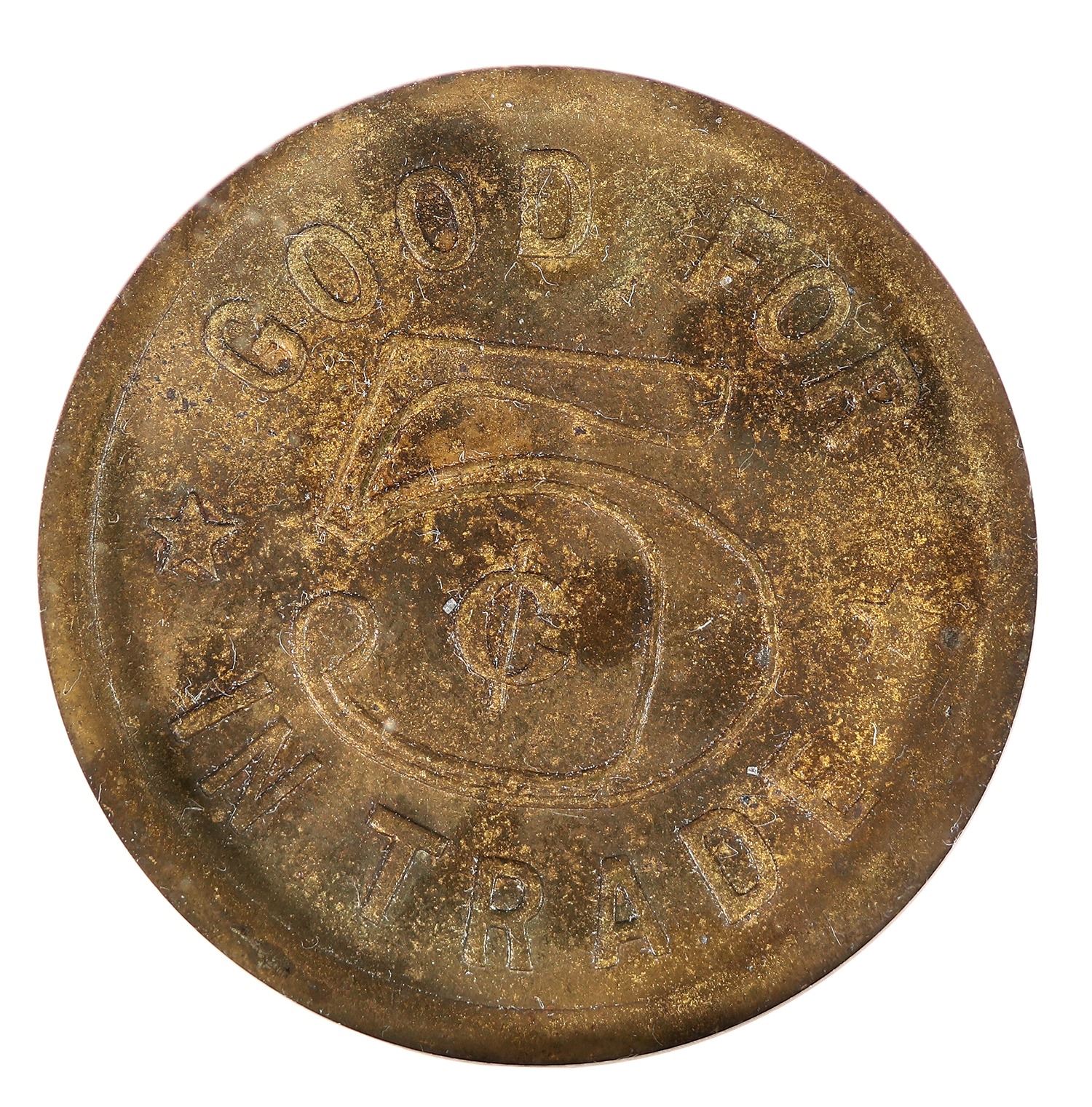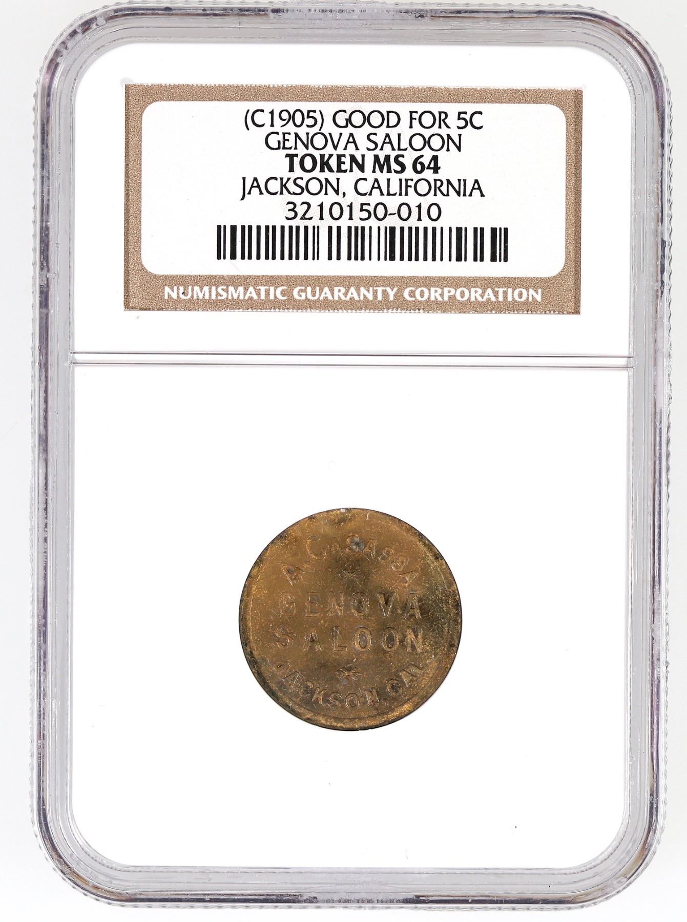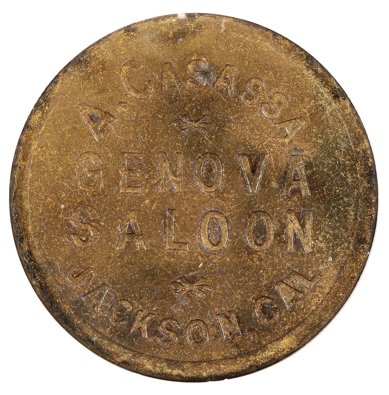 High grade gold country saloon token! NGC graded MS 64, perhaps the finest known: A. CASASSA / GENOVA / SALOON / JACKSON, CAL. // GOOD FOR / 5¢ / IN TRADE; Br. rd., 21 mm.