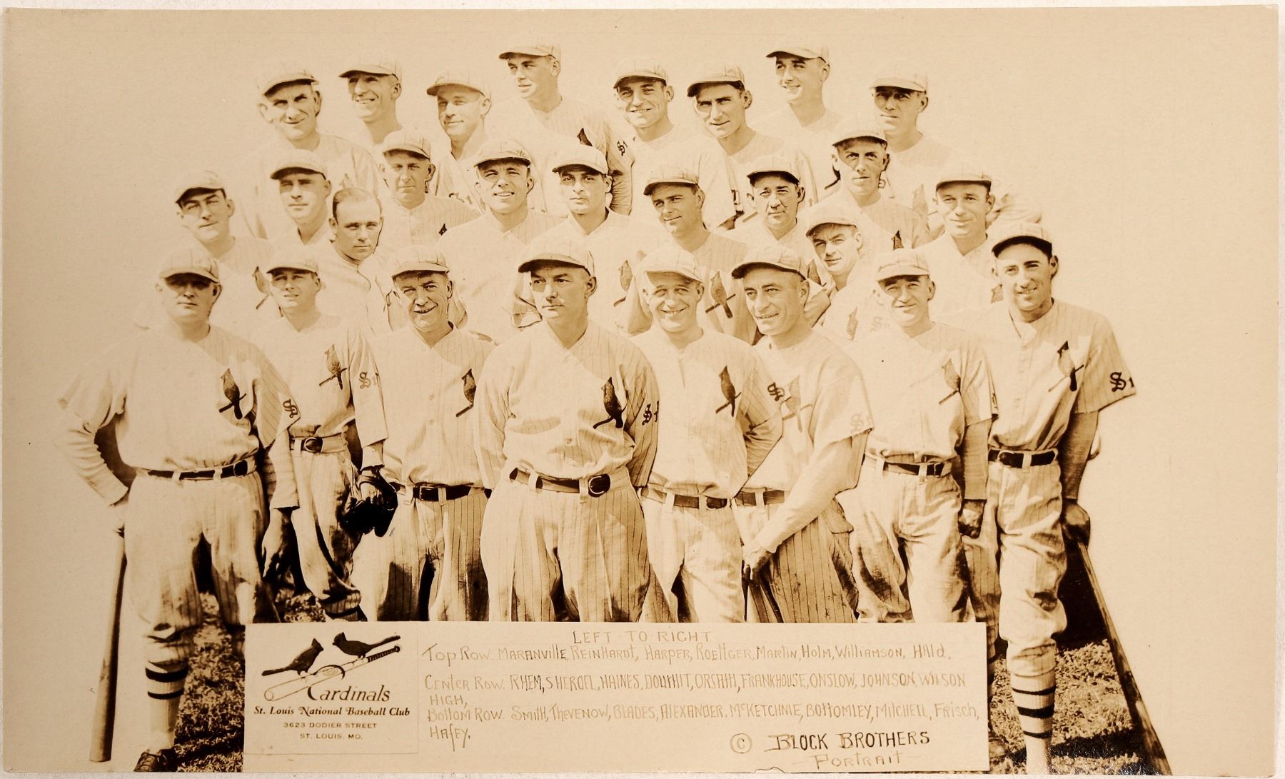 Authentic and vintage 1927 St. Louis Cardinals Baseball Team photo postcard featuring 27 players. The early logo of the St. Louis Cardinals on the bottom left. Includes Hall of Famers Frankie Frisch, Jim Bottomly and Grover Cleveland Alexander. Block Brothers postcard. Unused. Nice! rare St. Louis Cardinals collectible. The Cardinals that year went 92-61 finishing 1 1/2 games behind the Pirates lead by Big and Little Poison, Pie Traynor and Kiki Cuyler.