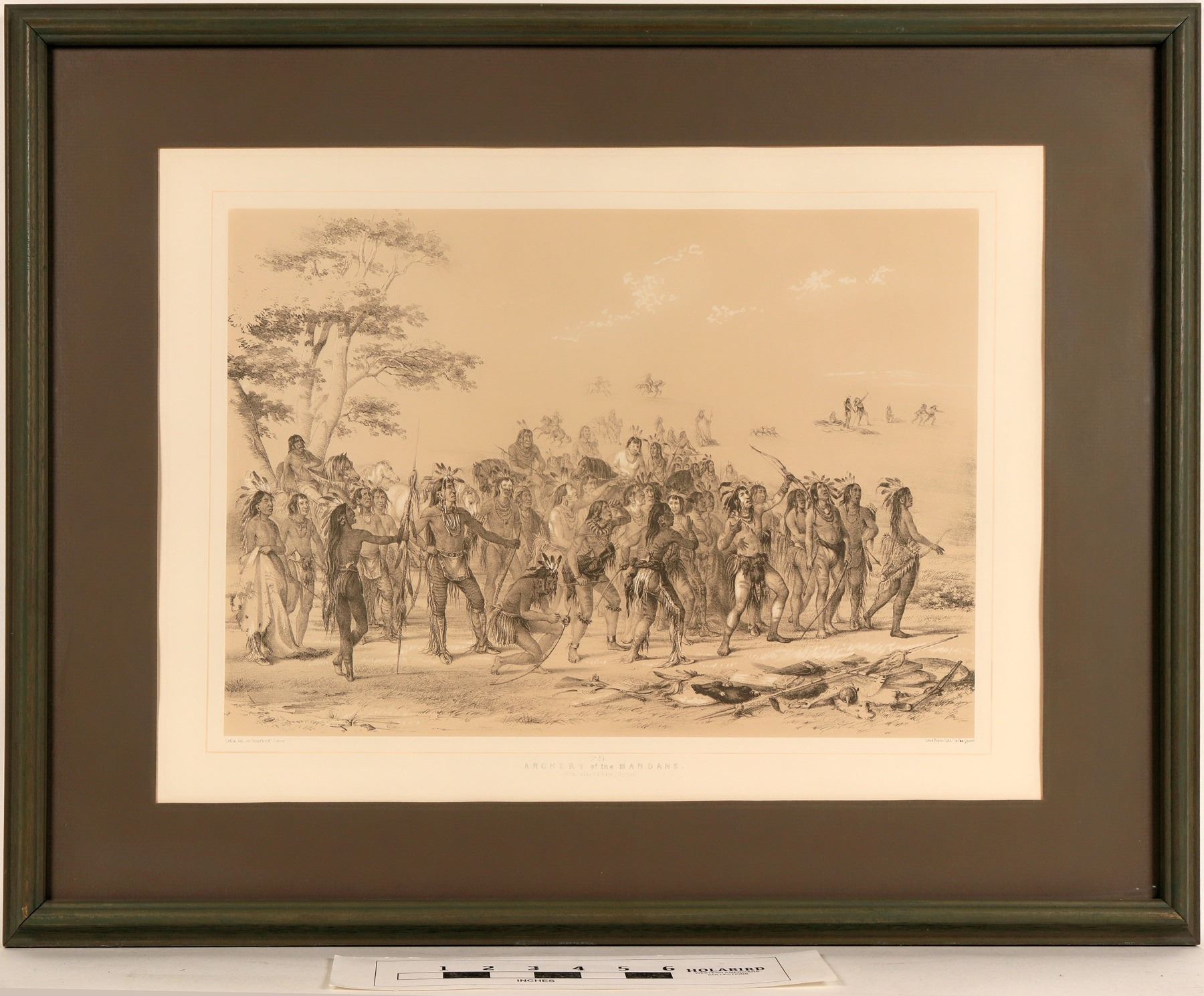 Archery of the Mandans by George Catlin, framed lithographic reproduction. At age 17, George Catlin (1796-1872) studied law and was admitted to the Bar in 1819. He so disliked practicing law that he gave up that career after only two years and enrolled in art school, becoming recognized for his skill in portraiture. He became interested in preserving the experiences and ways of life of the American Indians, and he subsequently made five trips across the United States to paint what he saw in American Indian culture, even as white settlers were pressing inexorably across the continent. He was also a collector of Native American artifacts, and he used these as reference materials in his artworks, which he gathered and published in folios. His 1844 North American Indian Portfolio was reproduced in 1970 by Sparrow Press in Chicago as tinted lithographs. This mounted, matted, and framed print is one from the limited edition set of 1000 copies. Professionally mounted, matted, and framed in verdigris-toned wood and glass, finished size is 27-3/4 x 21-3/4 inches with a matte opening of 20-1/2 x 15 inches. The frame appears to have never been hung. See photos for content and condition details.