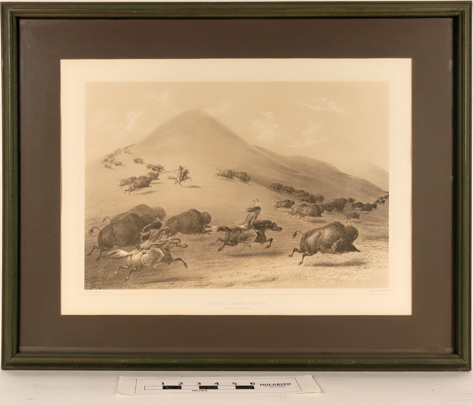 Buffalo Hunt, Chase, by Catlin, framed lithographic reproduction illustrating an Indian buffalo hunt across the American Great Plains. At age 17, George Catlin (1796-1872) studied law and was admitted to the Bar in 1819. He so disliked practicing law that he gave up that career after only two years and enrolled in art school, becoming recognized for his skill in portraiture. He became interested in preserving the experiences and ways of life of the American Indians, and he subsequently made five trips across the United States to paint what he saw in American Indian culture, even as white settlers were pressing inexorably across the continent. He was also a collector of Native American artifacts, and he used these as reference materials in his artworks, which he gathered and published in folios. His 1844 North American Indian Portfolio was reproduced in 1970 by Sparrow Press in Chicago as tinted lithographs. This mounted, matted, and framed print is one from the limited edition set of 1000 copies. Professionally mounted, matted, and framed in verdigris-toned wood and glass, finished size is 27-3/4 x 21-3/4 inches with a matte opening of 20-1/2 x 15 inches. The frame appears to have never been hung. See photos for condition and content details.