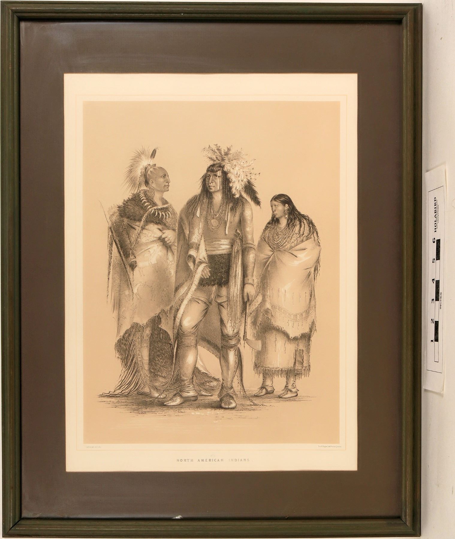 North American Indians by Catlin, framed lithographic reproduction illustrating the attire of two Native American men and one woman. At age 17, George Catlin (1796-1872) studied law and was admitted to the Bar in 1819. He so disliked practicing law that he gave up that career after only two years and enrolled in art school, becoming recognized for his skill in portraiture. He became interested in preserving the experiences and ways of life of the American Indians, and he subsequently made five trips across the United States to paint what he saw in American Indian culture, even as white settlers were pressing inexorably across the continent. He was also a collector of Native American artifacts, and he used these as reference materials in his artworks, which he gathered and published in folios. His 1844 North American Indian Portfolio was reproduced in 1970 by Sparrow Press in Chicago as tinted lithographs. This mounted, matted, and framed print is one from the limited edition set of 1000 copies. Professionally mounted, matted, and framed in verdigris-toned wood and glass, finished size is 21-3/4 x 27-3/4 inches with a matte opening of 15 x 20-1/2 inches. The frame appears to have never been hung. See photo for condition and content details.
