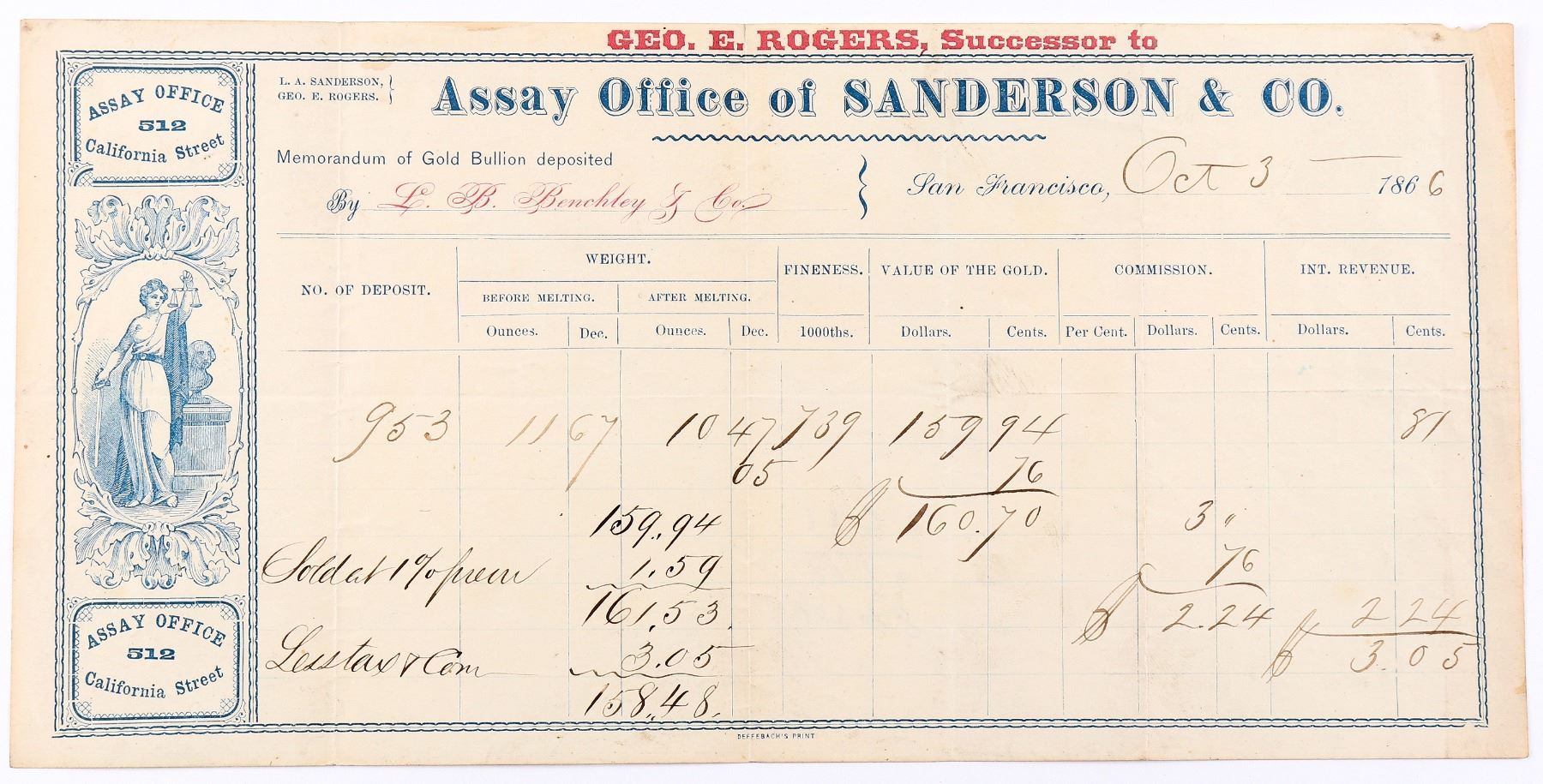 Geo. E. Rogers, Successor to Assay Office of Sanderson & Co., San Francisco, CA, Assay receipt dated Oct. 3, 1866, for 11.67 ounces of Gold from L.B. Benchley & Co. importers and jobbers of American and Foreign Hardware, Cutlery, Farmers, Mechanics, & Miners Tools. (see advertisement on p. lxv of Langleys San Francisco Business Directory for the year 1866, commencing December 1865). The Office is located at 512 California Street. The assay was probably for Gold dust and or nuggets as it was melted and assayed 739/1000 in Gold. George E. Rogers and L.A. Sanderson took over the Assay Office of G.W. Bell located at 512 California Street after he was killed in a huge Nitroglycerin explosion on April 16th, 1866. (See California Coiners and Assayers by Dan Owens, 2000.). L. A. Sanderson was previously a bookkeeper with Dickenson & Gammins wholesale groceries and provisions and George E. Rogers was a clerk working for G.W. Bell (see p.378 and 387 of Langleys 1866 cited above. Evidently Rogers bought out Sanderson who appears to have been the source of funding when both took over G. W. Bells Assay operations after the April accident earlier in the year. The title of the receipt in blue on white paper is ìAssay Office of Sanderson & Co. with a red printed legend on top ìGeo. E. Rogers, Successor to. This indicates that this Assay receipt form lasted probably less than one year, as later Geo. E. Rogers receipts are entitled ìAssay Office of Geo. E. Rogers, Successor to G.W. Bell. Also, the vignette of Lady Justice and Scales are identical in Sandersons and the latter Rogers receipts. The Sanderson & Co. without the red imprint of ìGeo. E. Rogers, Successor to is unknown and must have existed only a few months. Size: 10.5 x 5.25 inches Litho by Deffebachs Print. Extremely rare. Size: 10.625 x 5.25 inches. San Francisco California 1866