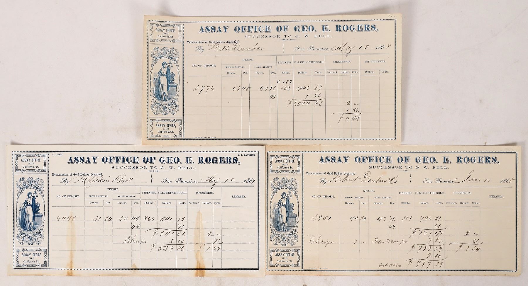 Interesting group of 3 assay reports from Rogers showing the variability of the companies submitting deposits and samples for assay, ranging from 31 to 62 ozs of gold. 1868 W H Dunbar. 1868 Hobart Dunbar Co., did business in Reno and Tahoe surrounding areas, Hobart was a timber magnate and this may have been from a mine on some of his property. 1869 Millikin Bros. Assay Office of Geo. E. Rogers, Successor to G.W. Bell. G.W. Bell had an assay office in the Wells Fargo office on California St. On April 16, 1866, a nitroglycerine explosion killed Bell along with 15 others and nearly leveled half a city block. A leaking box was brought in on an Eastern steamer and sent to the WF office for storage. This disaster swayed public opinion about nitroglycerine and caused Wells Fargo to no longer carry it in their coaches. San Francisco California Franklin Collection