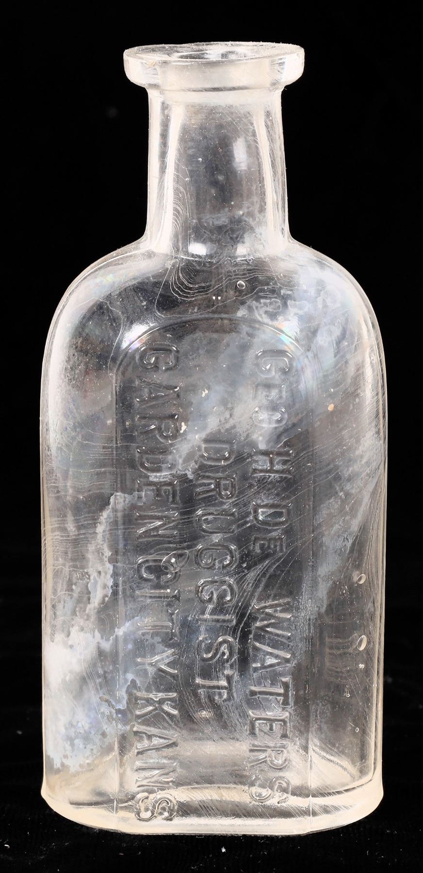 Embossed Geo. H DeWaters/Druggist/Garden City Kans. 4.25". No apparent chips or cracks.