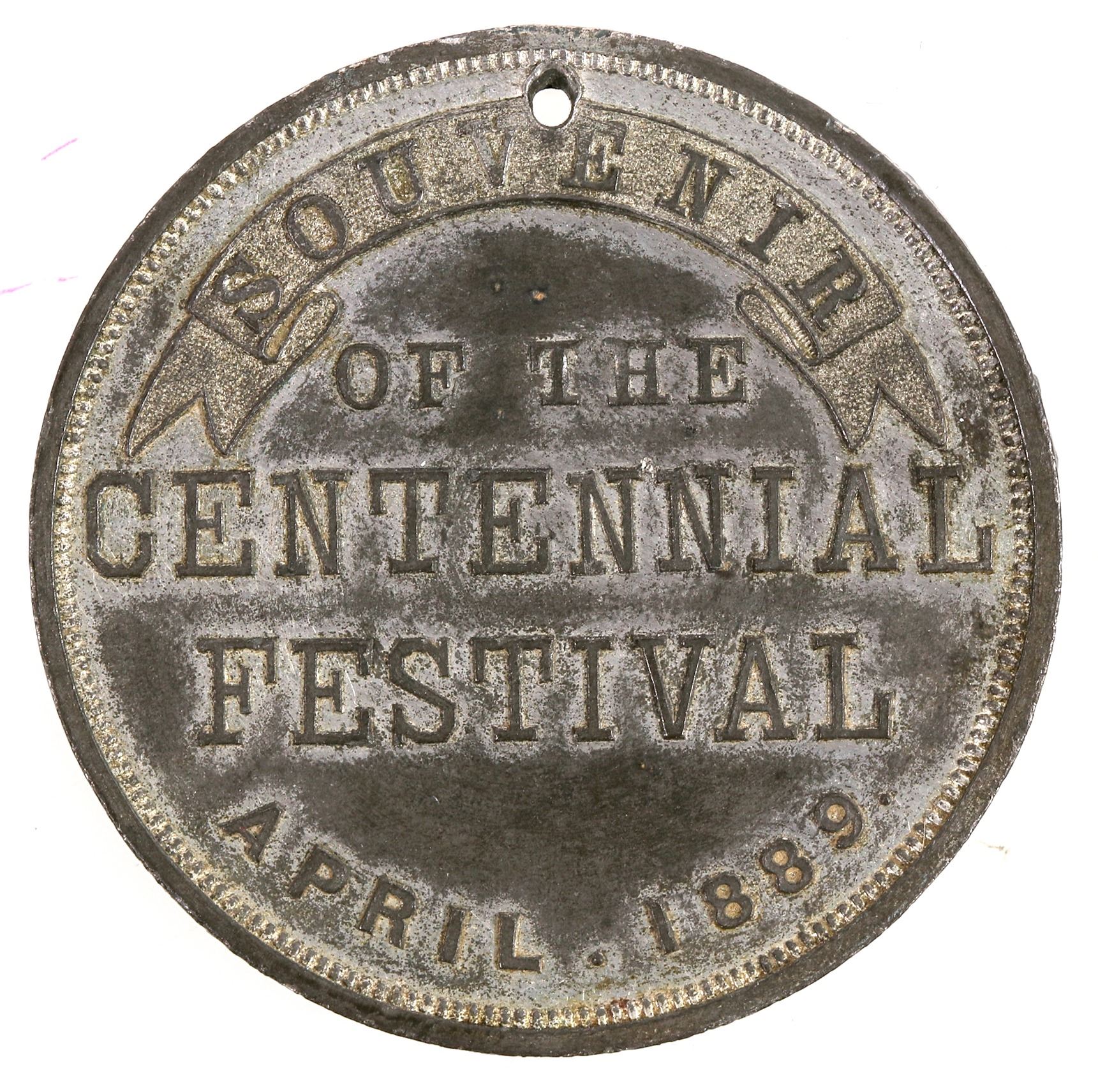 Medal honoring George Washington made for the 1889 Centennial Festival commemorating the 100th year after his birth in 1789. Found in Musante #GW1082, Baker 684. Struck bronze, common dies by R. Laubenheimer. Unlisted in 1999 Rular & Fuld.