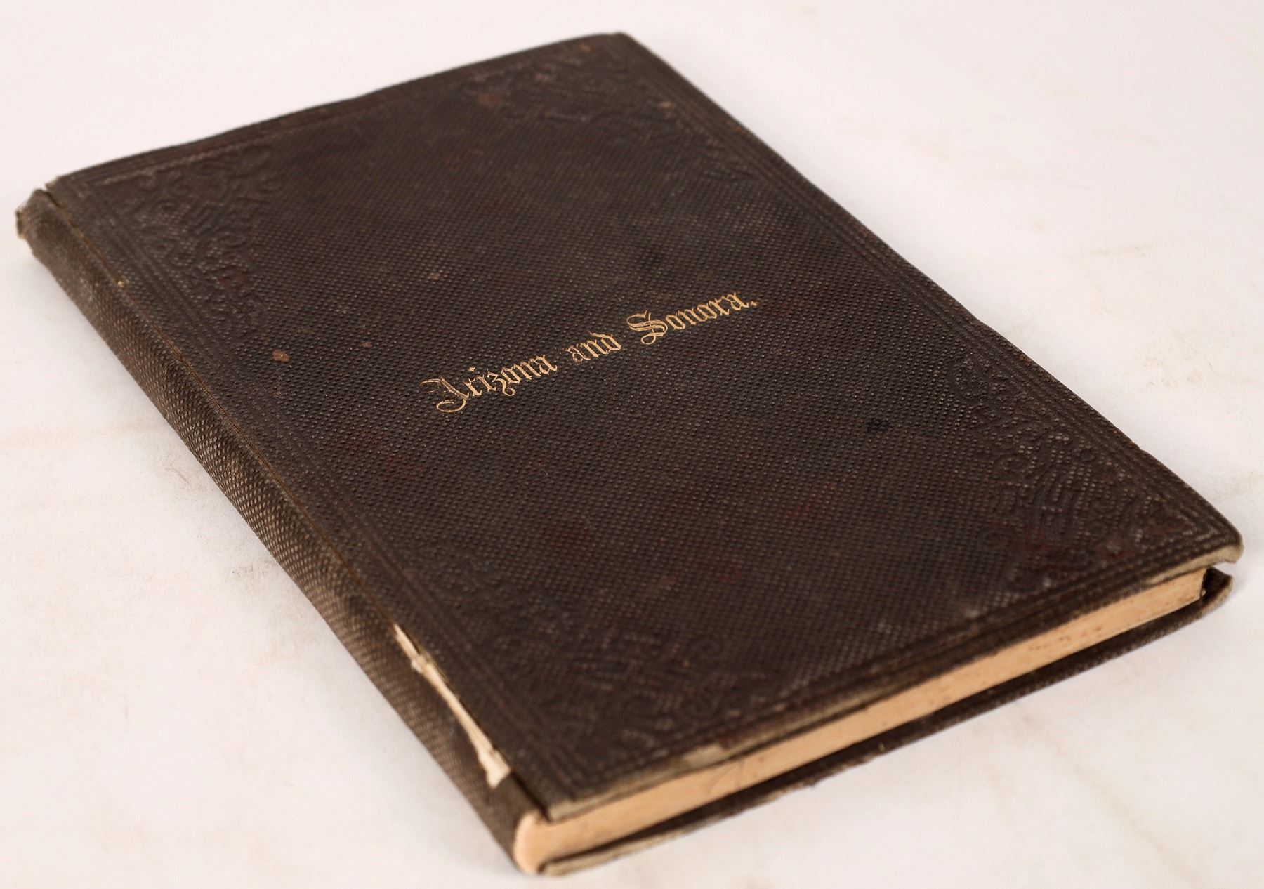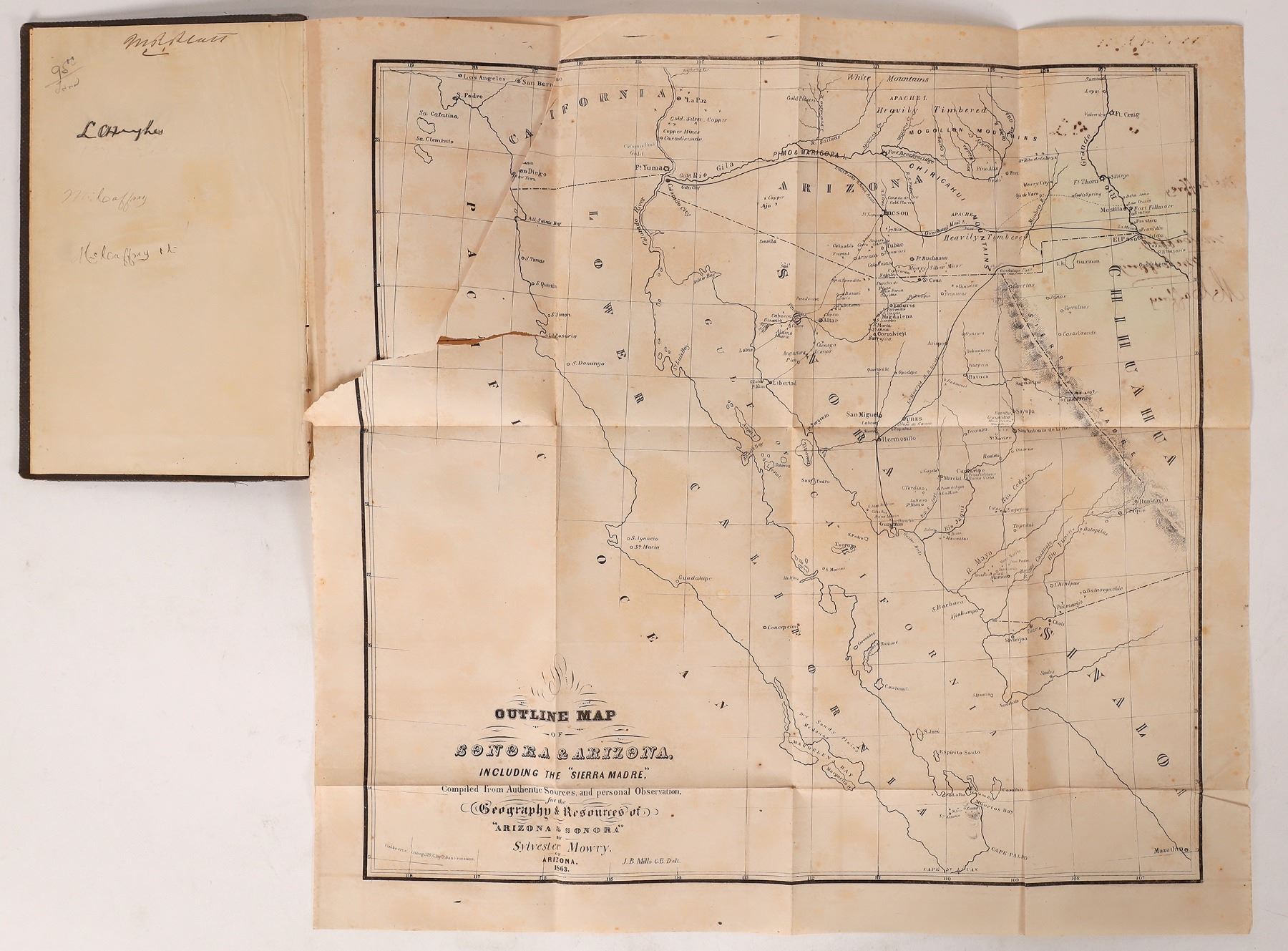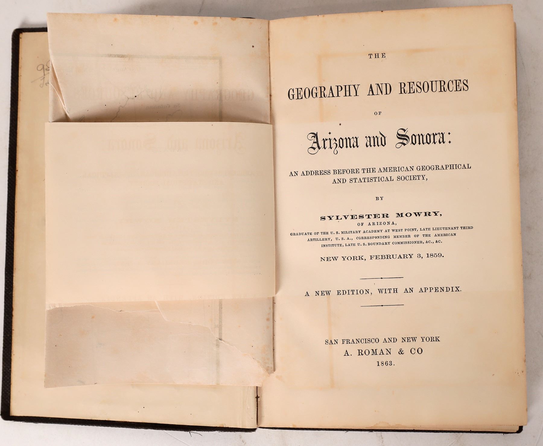 Very rare 1863, the first edition with the foldout map and appendix, Geography and Resources of Arizona and Sonora, an address before the American Geographical & Statistical Society by Sylvester Mowry. History of the area, its landmarks and statistics that frame the perspective of the speech. Has front Arizona foldout map with 4" left seam tear near top and foxing, spine wear100. 124pp. Please inspect Arizona