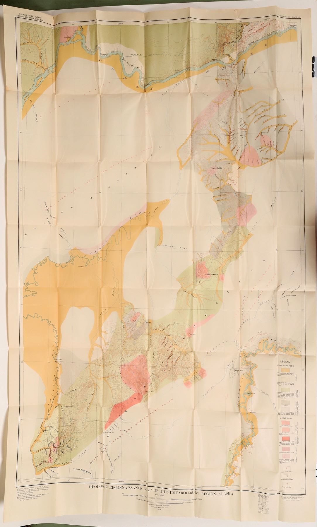 Gorgeous! Geologic Reconnaissance Map of the Iditarod-Ruby Region of Alaska. 30 x 50 inches, multi colored. Folded but no rips or tears. Along the Yukon River is one of the hottest placer gold mining camps in the world, mined into the 1980s. Alaska 1914