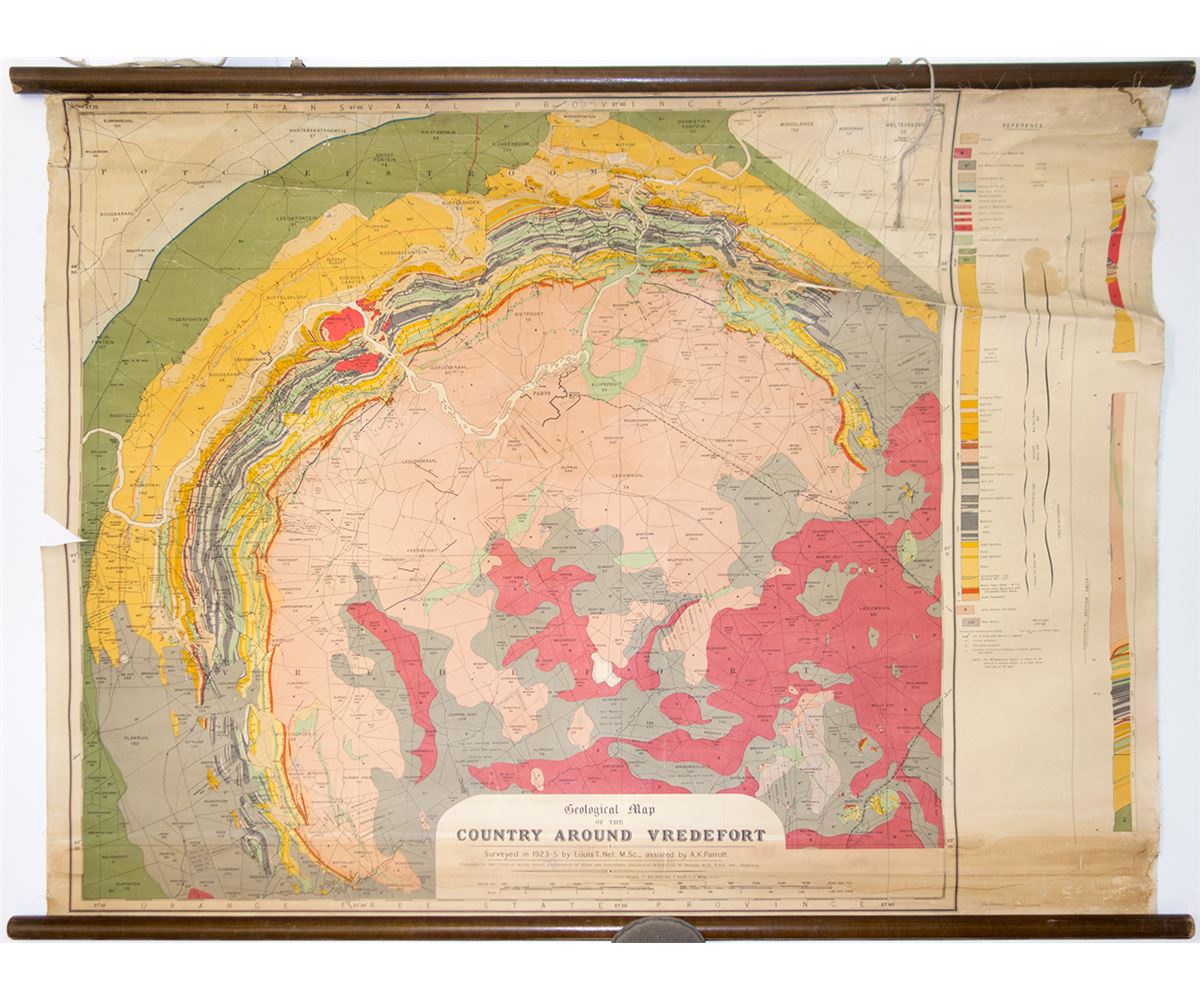 Geological Map of the Country Around Vredefort Surveyed in 1923-5 by Louis T. Nel, M.Sc., assisted by A.K. Parrott. Published by the Union of South Africa, Department of Mines and Industries, Geological Survey.-A.W. Rogers, Sc.D., F.R.S., ETC., Director. Reference Section, Horizontal Section ABCDE and Horizontal Section FG shown along far right. Reverse: S. AFRICA - VREDEFORT AREA, GEOL 1925. The area is the home of the UNESCO site of the Vredefort Dome, a gigantic scar left behind when a huge meteor (estimated size 10km diameter) collided with the earth about 2023 million years ago. The impact site is south of Parys, creating a 300 km wide, the biggest and oldest meteorite impact crater found on Earth. The impact happened about 2023 million years ago, at a time when the only living thing was a type of algae. To create a crater 300 km wide, the meteorite must have been about 10 km across and moving over 10 km per second. The Vredefort Dome is only the central part of the impact crater, called a dome because the rock layers were bent into the shape of an upside-down bowl 90km across by the impact. There are many gold -mining and prospecting sites in the dome area, dating to the late 19th century. Sections of exposed gold-bearing reef are visible throughout the area where sites are found, but mining in this area did not last long and development ceased within a short period of time. Multi-colored, measures 32" x 43", on rollers. Fair condition with soiling along the bottom, tears along the top roller, foldlines, with several tears along edges.