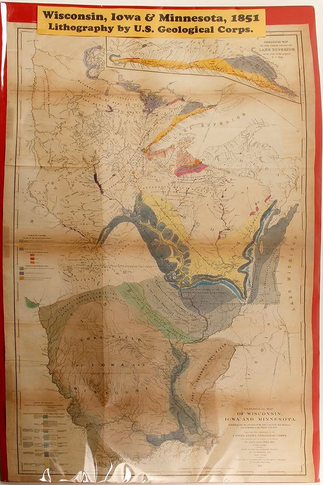 Lithography by U.S. Geological Corps. This map exhibits the extension of the Iowa Coal field into Missouri & its relation to the Illinois Coal field. It shows magnetic iron ore area. This large map is in good condition, there are no tears in folds. On Mat Board (not adhered) with plastic covers. If mats are shipped then additional shipping may apply. 28" x 45". (Potter Collection) HWAC# 59616 Date: 1851 Location: Wisconsin