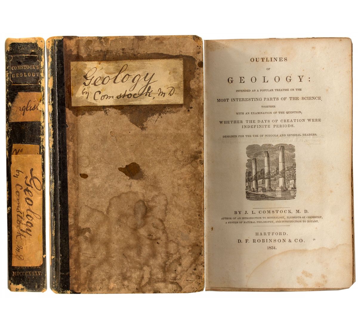 "Outlines of Geology: intended as a popular treatise on the most interesting parts of the science, together with an examination of the question, whether the days of creation were indefinite periods. Designed for the use of schools and general readers. By J.L. Comstock, M.D., author of An Introduction to Mineralogy, Elements of Chemistry, A System of Natural Philosophy, and Introduction to Botany." Hartford. D.F. Robinson & Co., 1834. 336 pages. Fascinating work that covers a variety of topics, including geological processes, fossils, Egyptian mythology, Kepler, Werner, climate, etc. Even has a "Table of Coincidences" between biblical and geological explanations. Condition: heavy wear for this 180 year old book. Heavy staining, soiling, foxing. Chips to the spine. Binding fairly tight. Very unique! Date 1834 , hwac 20821