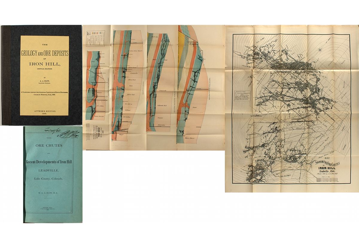 Written and boldly AUTOGRAPHED by A. A. Blow. This was a paper read before the American Institute of Mining Engineers. 25 pages. One 2 page fold out of area. Two large maps accompany the booklet: (1) Ore chutes of Iron Hill, 31 x 25" and (2) sections through Iron Hill, color, 27 x 24". Both March of 1888 by A. A. Blow.