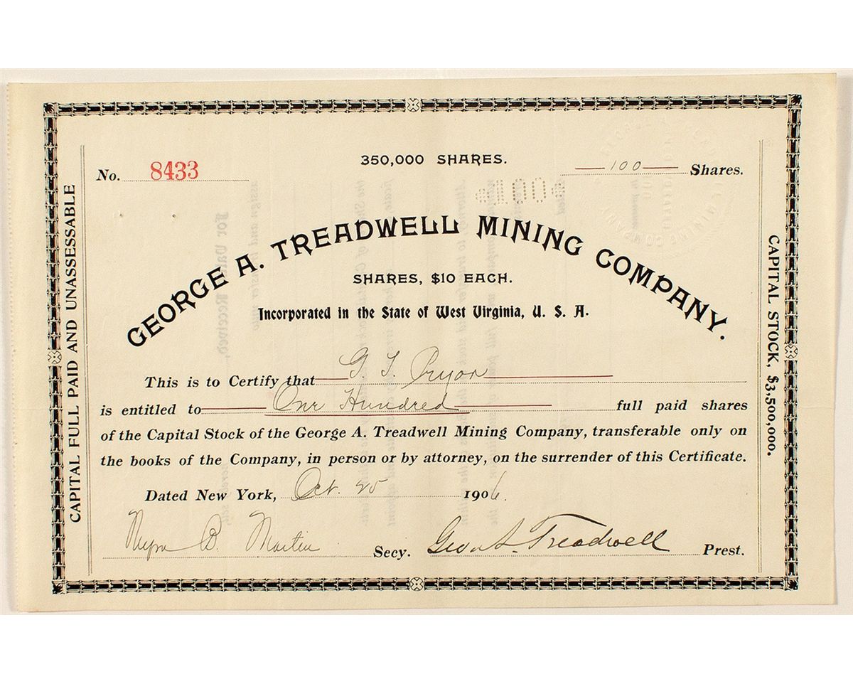 Cert. #8433, issued at New York in 1906 to G.J. Pryor for 100 shares. Signed by George A. Treadwell as president and Myra B. Martin as secretary. Stevens, of the Copper Handbook, does not mince words with his description and write up of this company in the 1908 volume. His choice of words and style is far too perfect not to paraphrase in quotes. "Controls the Brookshire Mining Co through 80% stock ownership. Has upwards of 2,000 shareholders, of whom 1440, in August, 1907, were holders of 50 shares or less, more than half being women, duped by this gang of thieves. Practically all of the company's statements regarding rich ores and large ore bodies are fairy tales. The Boggs mine, which is idle, is held subject to a mortgage of $150,150.40 which will never be paid. Buildings include; an office building put up on lands not owned, and not even leased, which is a fair sample of the business methods of the company. The company has three smelters, two worthless and one unnecessary. A hydrocarbon smelter, designed to burn petroleum and turn out blister copper from ore by a single fusion, was built at Arizona City, on the advice of Geo. A. Treadwell, a doddering old scientist who was used as a stalking-horse by the company, and proved a ridiculous failure, though the company sold considerable stock on the strength of its alleged revolution of existing processes. The company's various smelters cost $158,893.12, according to the company's books, but the accounts were kept so crookedly and by such unmitigated scoundrels that it is impossible to say what is to be believed. The George A. Treadwell Mining Co. is a deliberate and intentional fraud, conceived in iniquity and born in sin, promoted by the late Gen.Walter S. Logan, a notorious shyster lawyer of New York, who is said to have left an estate of $500,000, accumulated by all sorts of rascalities. Everybody connected with the company in an executive capacity in its palmy days of swindling was either a fool or a rascal. The management has not hesitated at any lie that seemed convenient or likely to prove profitable, and its financial statements were deliberately false, while the advertisements, put out over the name of Myra Martin, were colossal lies. A complete exposition of the rottenness of the company would require several pages, which can be devoted to better use, and the property is dismissed with the statement that the company is a swindle of the first magnitude, without a single redeeming feature. Idle and should be wound up, after the principals are imprisoned. (Copper Handbook, 1908, p.711-712). Unc.Very Fine.City: VerdeCounty: YavapaiState: AZDate: 1906