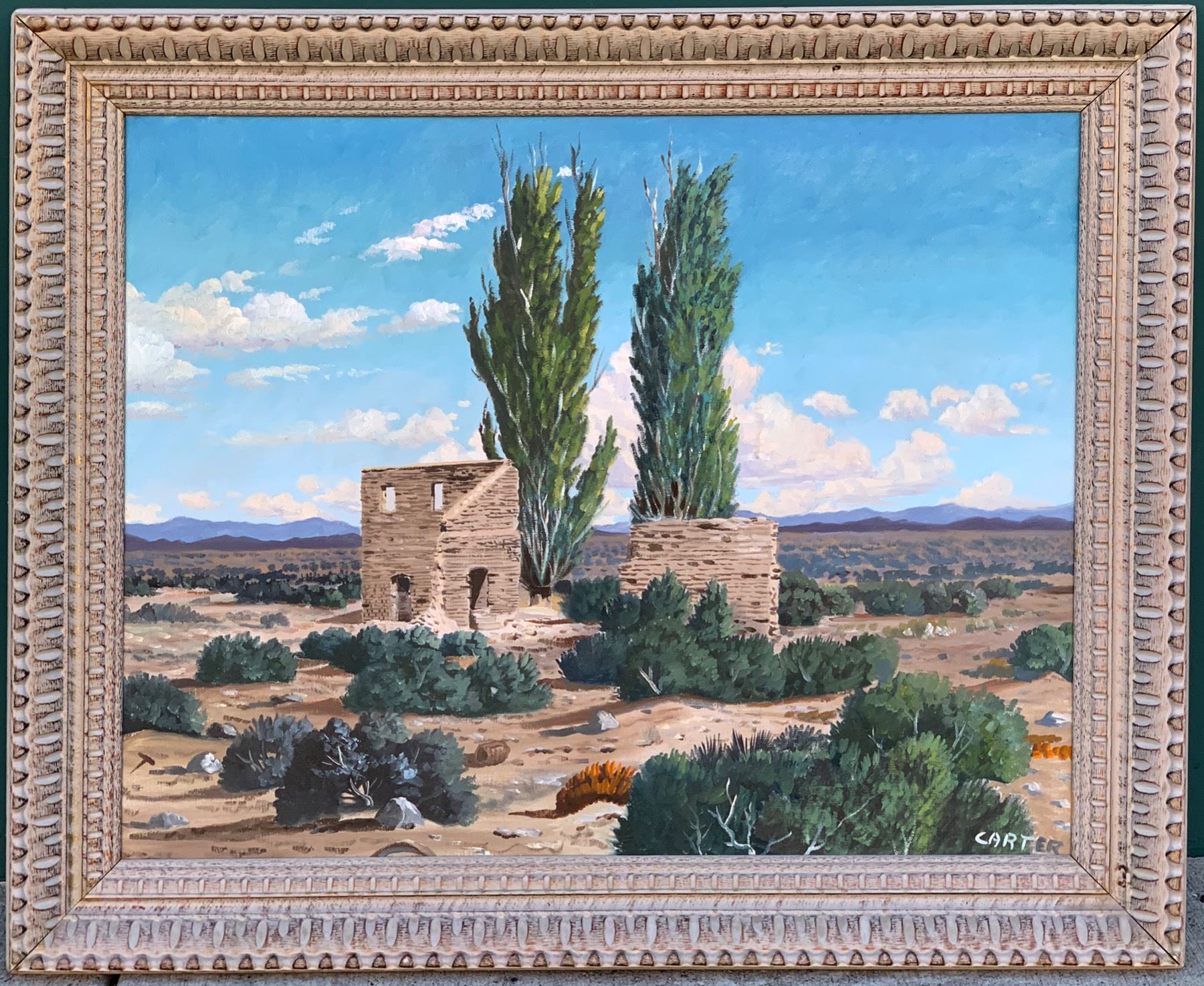 George Carter was a Nevada artist in the 1950's and 1960's. He was actually quite successful wining second place in a regional art exhibit in 1962. He was, however, known for having trouble with alcohol. He would paint in his hotel room often trading paintings for room, board, and drinks. He is quite famous for taking his drawings from Nevada magazines. This particular drawing comes the 1960 No. 2 issue of Nevada Highways and Parks. It is actually the front cover. San Antonio was a small stage stop built around a group of springs. It became a major stop on the line between Belmont and Middlegate in the 1860's. More background notes on San Antonio and more information on George Carter is included. Painting is 24 x 36" without the frame. Frame certainly looks period. 1960 Nevada Highways and Parks is included with the original photograph. State: Nevada City: San Antonio, Nye Date: HWAC# 99449