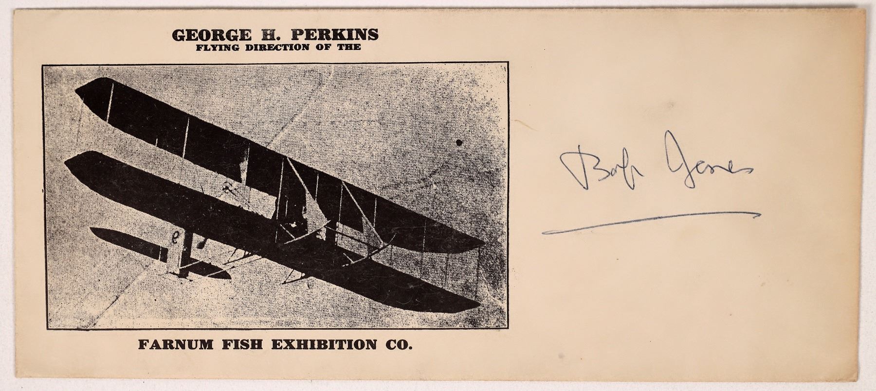 Pictorial cover for the George H. Perkins, Flying Direction of the Farnum Fish Exhibition Co. Signed by Bob Jene(?), possibly a pilot. Vignette of early plane, which was a Wright Brothers aeroplane that Perkins was flying on exhibition. Nice early airplane cover.