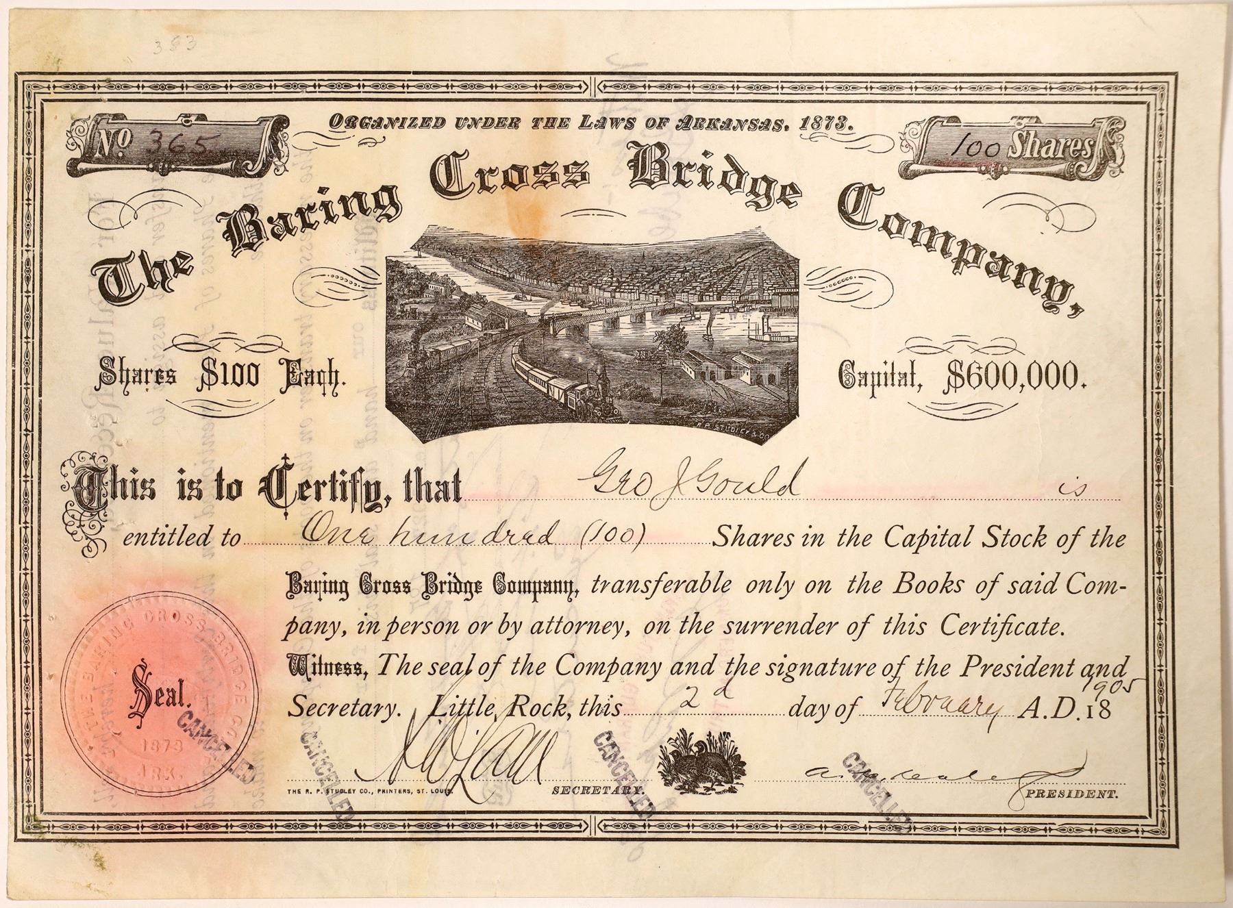 # 364 for 100 shares to George J. Gould in 1905. Bridge vignette. Red discoloration where seal should be placed. Stamp cancelled. The Baring Cross Bridge was the location of the first bridge over the Arkansas River. It was opened in 1873. It was located in downtown Little Rock, Arkansas. George Jay Gould I was a financier and the son of Jay Gould. He was himself a railroad executive, leading the Denver and Rio Grande Western Railroad, Western Pacific Railroad, and Manhattan Railway at times