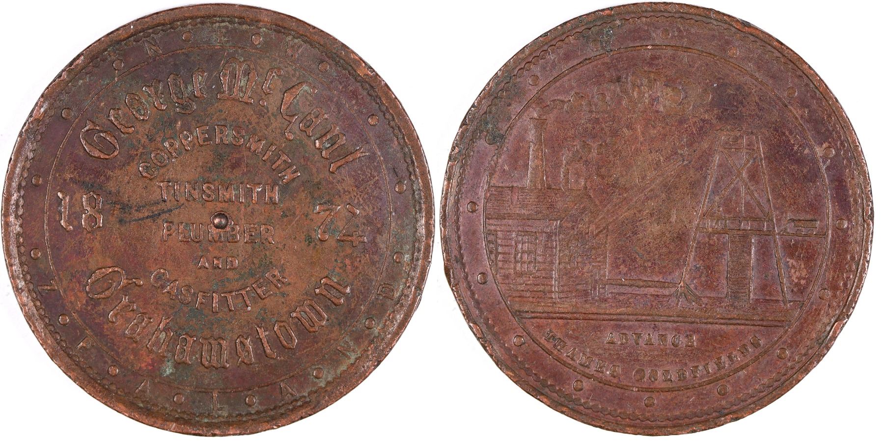 Obverse: scene of a poppet head associated steam works. Two men are working on the platform of the poppet head. Reverse: Text identifying McCaul as a coppersmith, tinsmith, plumber, and gasfitter. Neat mining related token. Copper, 34mm. VF/EF