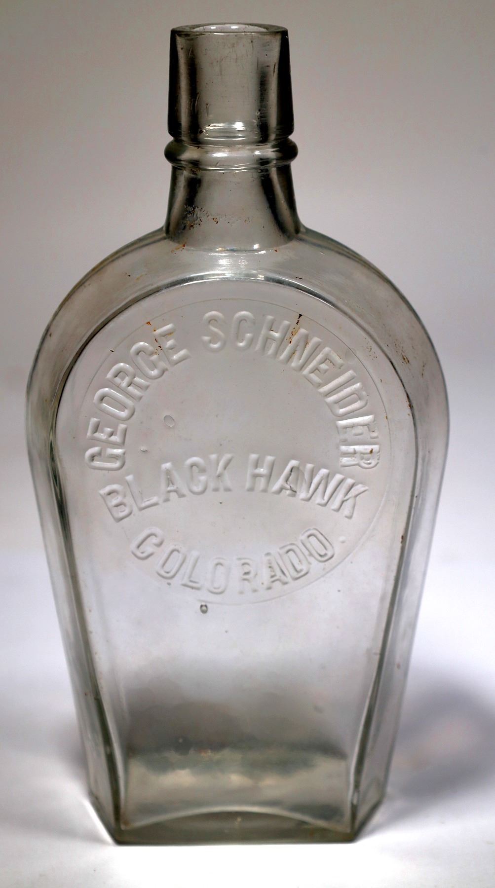 Preble W-2, but possibly an unlisted size variant. W-2a is listed as 7 5/8", while this flask is 7.25" George Schneider / Black Hawk / Colorado. Clear glass, wiped top. Bubbles, tiny chip on reverse shoulder, rough area on neck, some haziness. A very nice bottle! Please inspect.