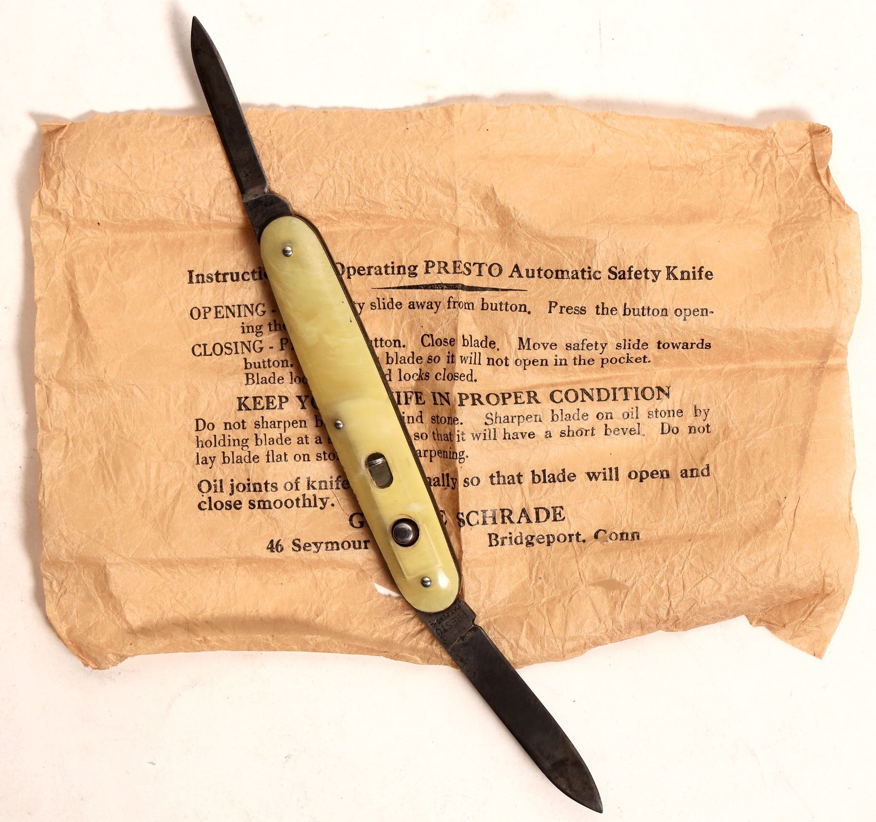 This double blade auto. knife has push button releases and a locking slide for each blade. In cream celluloid scales. The knife comes with a box and instructions for use, patinated blades. 3.5 in. closed length.