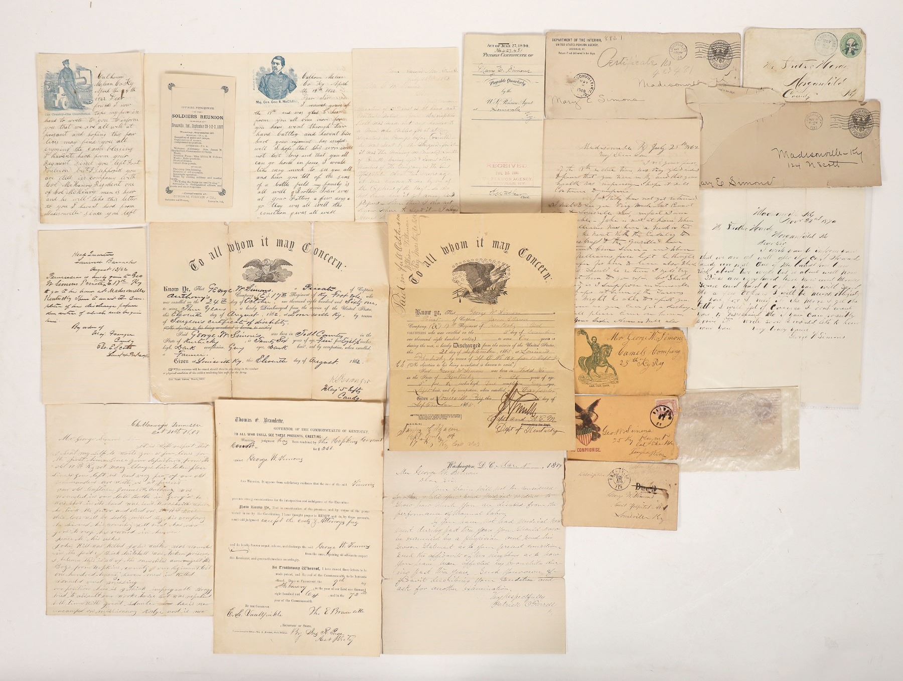 A collection of correspondence and documents relating to George W. Simons, a Union soldier who served in the 25th Regiment, dating from 1862 to the 1910s. The collection contains six letters sent during the Civil War to Simons from his friends and former comrades, telling him about their experiences in the war. One particularly dramatic letter from his former regiment comrade 'J.H.H.' beautifully describes victories and losses of the regiment since Simons' departure, describing military action as well as the loss of individual soldiers: of one captain, he writes that "he has served his country well and has now gone to reap his reward in Heaven. Peace to his ashes." The letters carry a strong undercurrent of patriotism and belief in the Union cause. Three pieces of correspondence from the years following the war are also included; these include a personal letter as well as the attempts of George and his daughter Mary Simons to secure his pension. Also included are three official wartime documents: two certificates of discharge for Simons, and one legal document remitting the fee he was to pay for an unspecified court case.