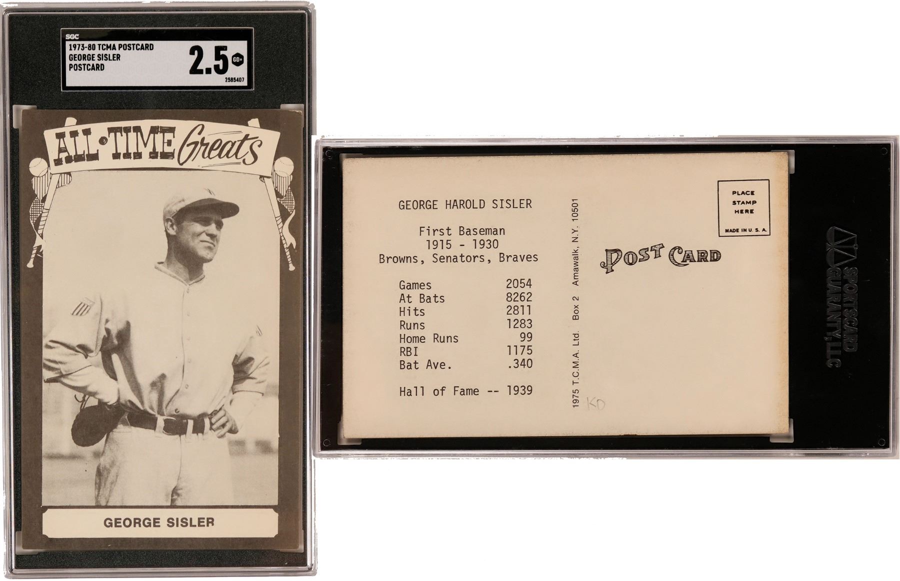This is a TCMA postcard featuring first base man George Sisler. Sisler played 15 years for the St. Louis Browns, Senators and Braves. Card is in very good condition. See photos for more detail.