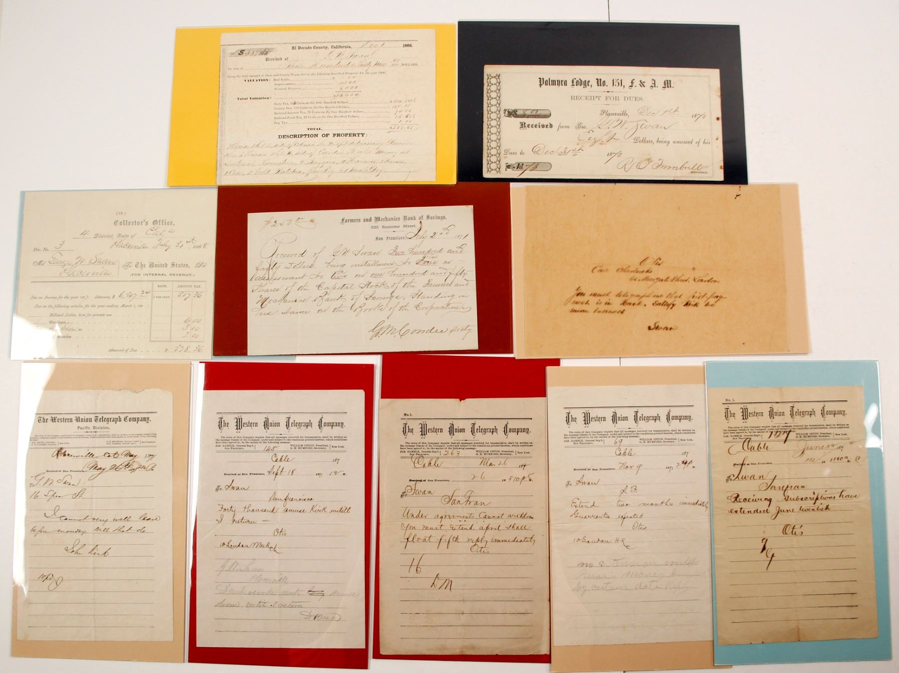 Lot of 10 pieces related to George W. Swan. In our June 2018 auction, we sold a group of Lake Tahoe toll road material that included pieces from Swan. In addition to being president of the Placerville & Sacramento Railroad, Swan operated toll houses outside of Placerville and on the path through Lake Tahoe to the Comstock Lode in Nevada. He was also involved in mining interests around Placerville, and served as a lawyer for the Kingsbury estate. He settled in San Francisco. This group of material includes: 1) Five telegrams sent to Swan and one sent by him. c.1870s. Messages are brief, so the context is difficult to ascertain. Four are sent by someone named Otis in London. 2) Farmers & Mechanics Bank of Savings, San Francisco, 1871, receipt for assessment received from Swan on stock shares in the company. 3) Placerville Tax Collector's receipt, 1868, for $328.36 being taxes on Swan's income, 1 carriage, 1 gold watch, and 60 silver plates. 4) Palmyra Lodge, F. & A.M., receipt 1870, Placerville, for payment by Swan for his dues. 5) 1866 El Dorado County Property Tax receipt for Swan. Paid $339.67 for taxes on: house and lot on E. side of Coloma St., 3 houses & lots on Garder St., money at interest, furniture, 2 buggies, harnesses, horses, 1 cow, 2 gold watches, and 1 male dog.