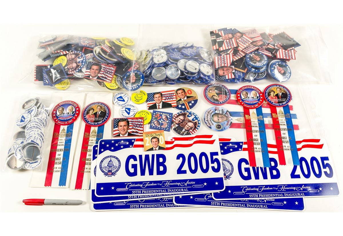 Large lot featuring approximately 150 items of George W. Bush campaign material, a majority of which is from the 2000 election. There are around 50 square buttons, about 30 buttons from the State of Nevada also promoting Bush as well as Jon Porter for Congress and John Ensign for U.S. Senator, 9 2005 inauguration signs, and 6 2005 inauguration ribbons.