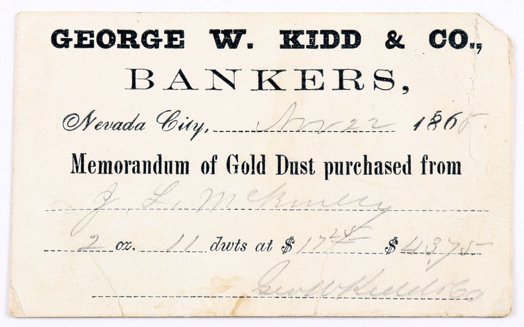 George W. Kidd & Co. Bankers, Nevada City - March 22, 1860, Gold Dust Receipt - Memorandum of Gold Dust Purchased from J. L. McKinley 2 oz. and 11 dwt. at $17.25 per oz. total $43.75. Signed Geo W Kidd. Calculations on back of card. Reference from ìFinancing an Empire ñ History of Banking in California by Ira B. Cross 1927. Vol. I, p. 243: ìThe Directory of Nevada City and Grass Valley for 1861 contains the advertisement of George W. Kidd, Banker, located in the ëGranite building on Broad Street, Nevada City. He was an assayer as well as a banker, which was of course the rather customary practice of bakers in the mining districts. On May 9th, 1865, an advertisement in the Nevada Daily Gazette: Sale of Banking House and Assay Office, G.W. Kidd to Hinds & Tully. From the Stockton Dailey independent Oct. 12, 1867: ìCOMING to STOCKTON ñ The Nevada 'Transcript' thus introduces 2 gentlemen whom we welcome to our midst: ìJ.W. HINDS, of the banking house of George W. KIDD & Co., goes to Stockton to take charge of the banking business to be opened in that city on the 15th inst., under the firm name of Kidd, Hinds & Co. Captain KIDD recently purchased a fine building in that city and has fitted up an elegant banking house. These gentlemen are thoroughly acquainted with the business, are reliable and accommodating, and backed by ample capital for sure business. We commend them to the citizens of San Joaquin Valley. From the Stockton Dailey independent Oct. 12, 1867. One corner slightly clipped, otherwise Fine. Size: 3.5 x 2.25 inches. San Francisco California 1860