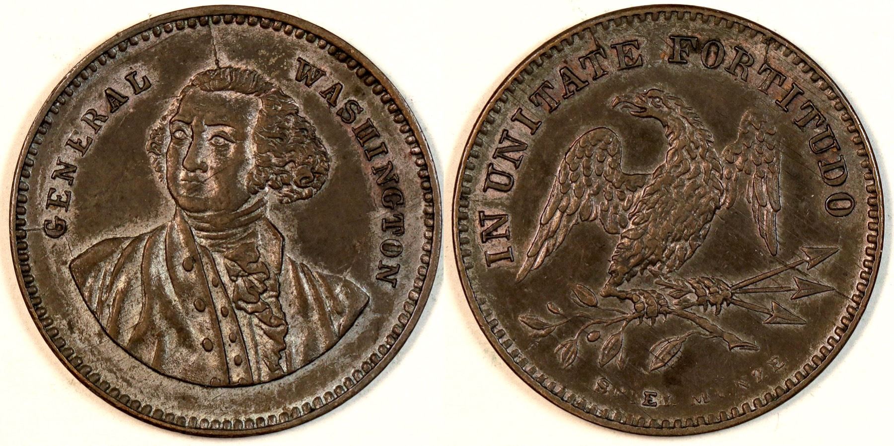 Extremely rare white metal, silvered counter; Obv.: George Washington - 150; Rev.: Eagle - 50. AU condition.