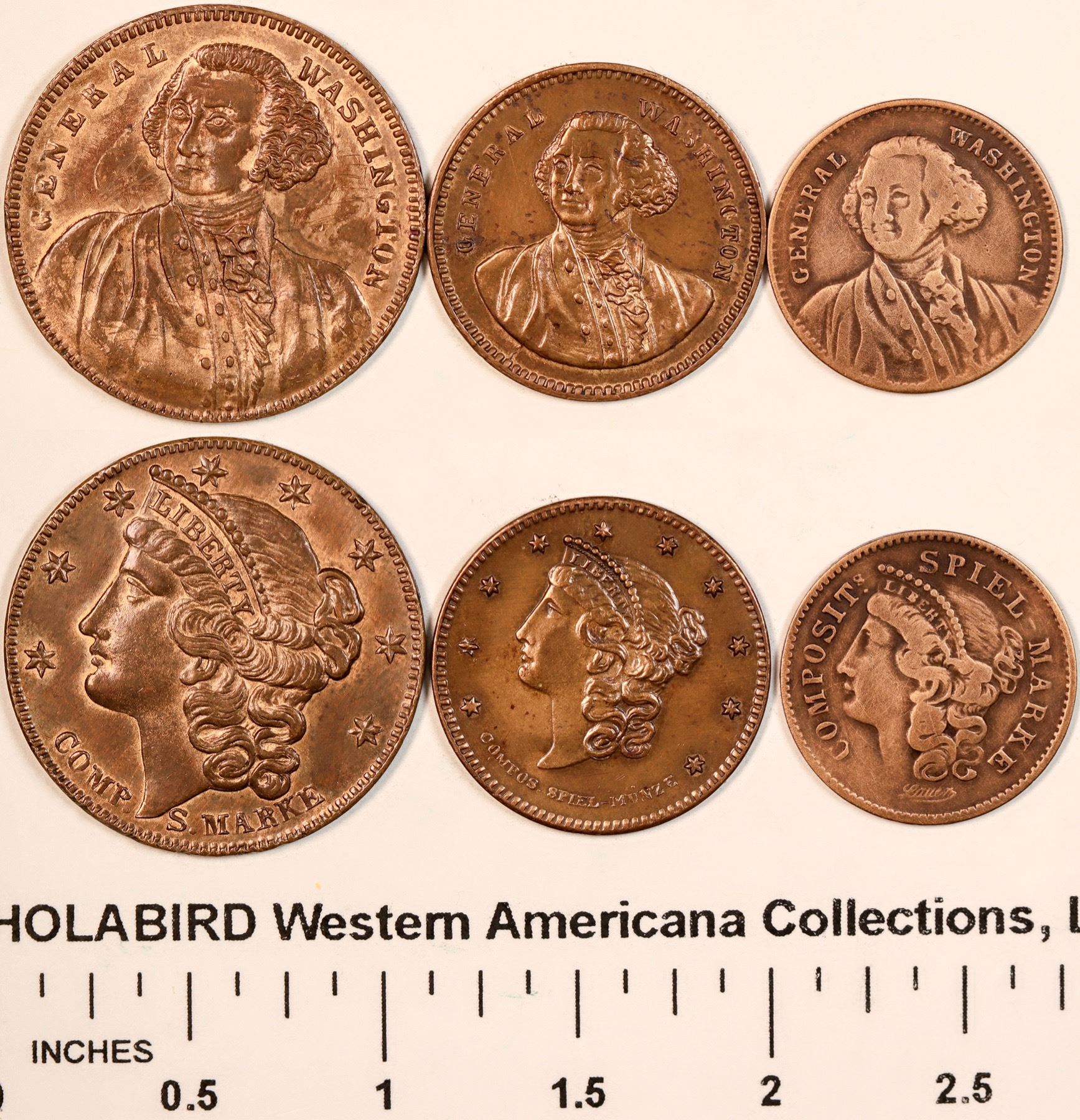 Lot of three Liberty Head reverse, George Washington obverse counters in the $2 1/2, $5 and $10 size.