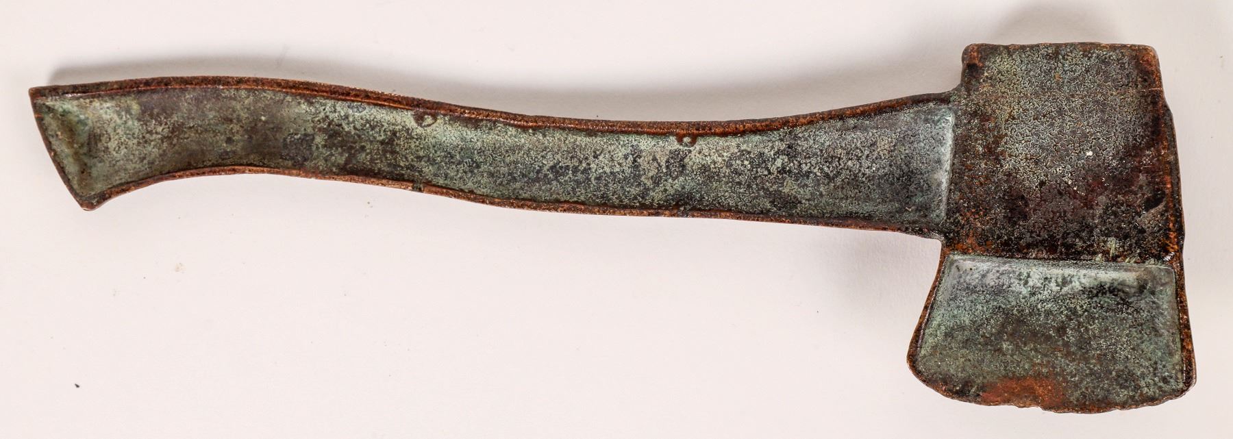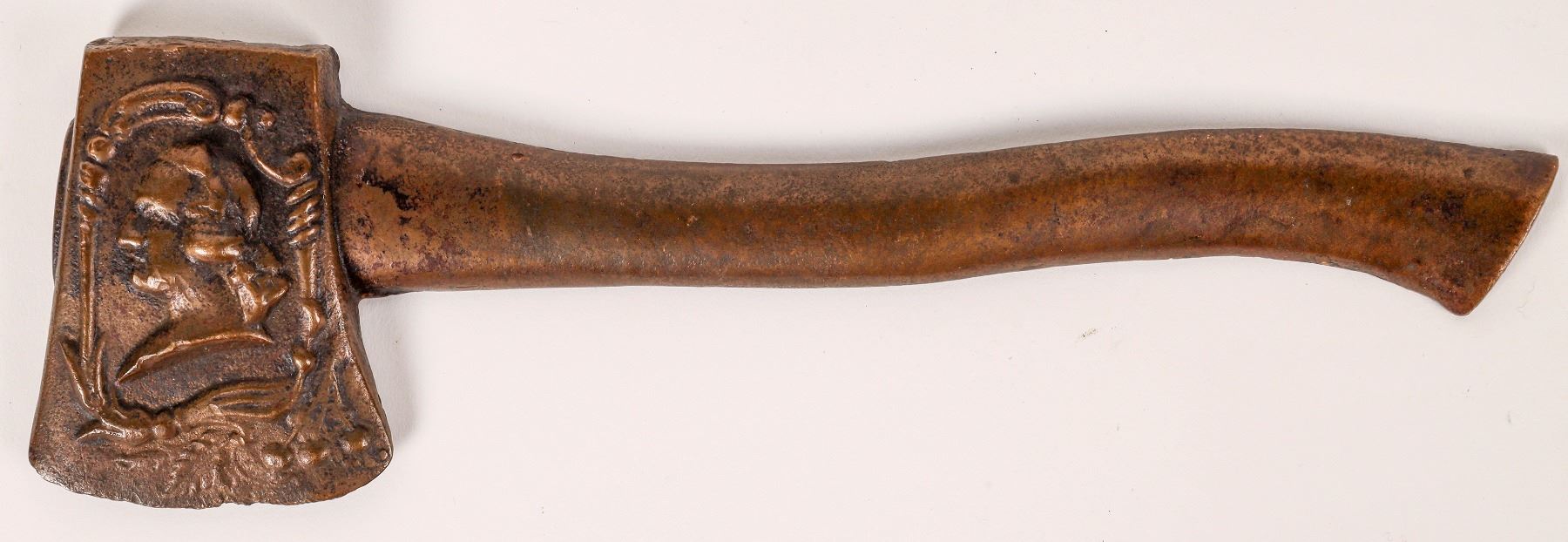 This bronze hatchet carries the bust image of George Washington. It measures 9 in. in length without any other markings. Many items of Washington memorabilia have his name and hangers but this one has none. No date or maker's marks; likely a souvenir commemorating the centennial of his birth or inauguration without duplicating another casting. Fine bronze oxidation on the reverse side. 9in. X 3 in. A rare find in very good condition.