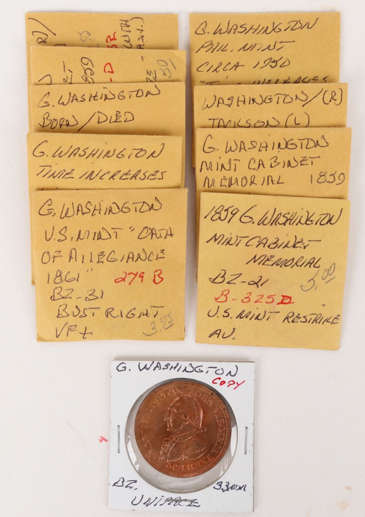 Lot of ten medals featuring our first president: Lincoln/Washington (BZ-18); Washington (BZ-33) "Time Increases His Fame"; Washington Philadelphia Mint (BZ-34); Washington "Oath of Allegiance 1861" (BZ-31); Washington/Jackson (BZ-18); Washington Born/Died (BZ-18); Mint Cabinet Memorial (BA-21); Washington (BZ-21) (2); uniface: born Virginia. [