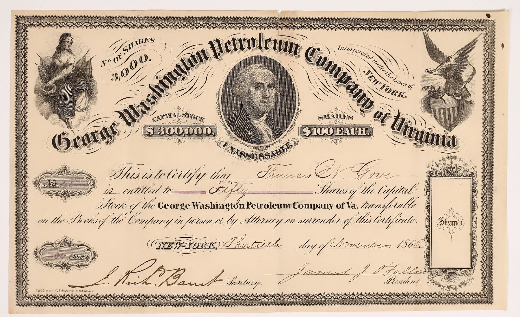 Unique! Inc. in New York. No. 48, issued to Francis N. Gove in 1865. Signed by president James J. O'Fallon and secretary Barret. Not cancelled. Three vignettes including a portrait vignette of George Washington. Printed by Ferd Mayer & Co., NY. Deep folds with separation. 6.75 x 11" No information found online including any mentions on newspapers.com.